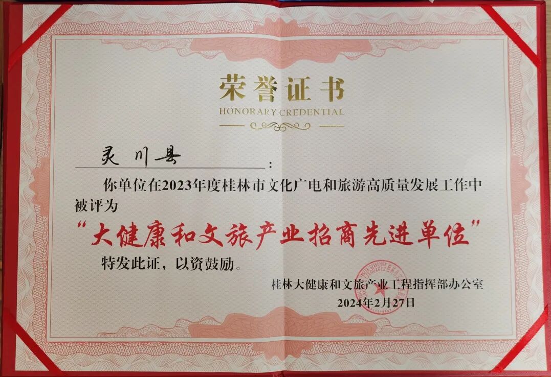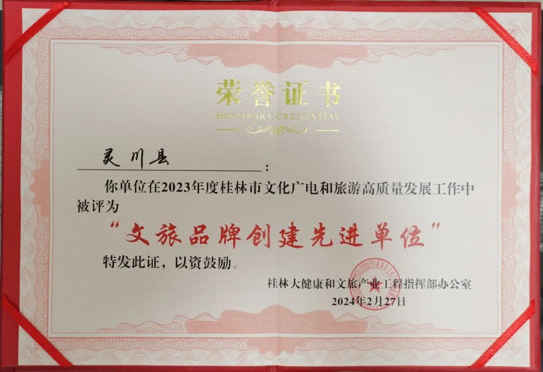 我局在2023年度桂林市文化广电和旅游局高质量发展工作表扬名单中,获得了“文旅品牌创建”和“大健康和文旅产业招商”两项荣誉。