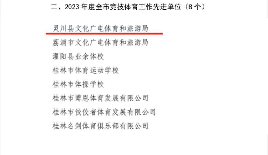 灵川县文化广电体育和旅游局荣获2023年桂林市竞技体育工作先进单位。
