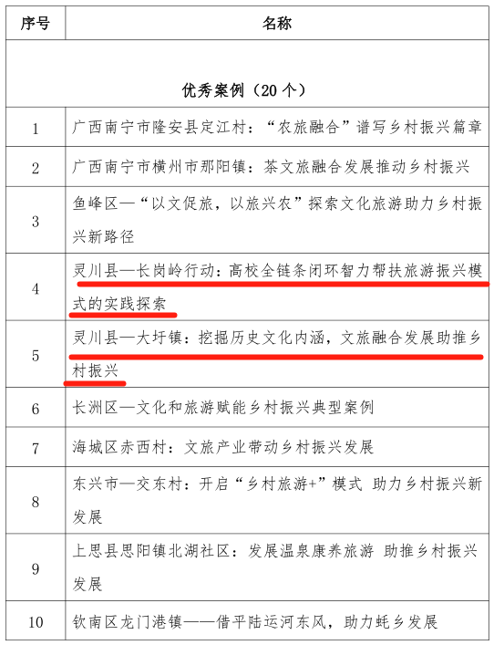 2024年4月,在广西壮族自治区文化和旅游厅举办的文化和旅游赋能乡村振兴典型案例征集活动中,我县的《长岗岭行动:高校全链条闭环智力帮扶旅游振兴模式的实践探索》和《大圩镇:挖掘历史文化内涵,文旅融合发展助推乡村振兴》两篇案例脱颖而出,榜上有名,荣获优秀案例奖。