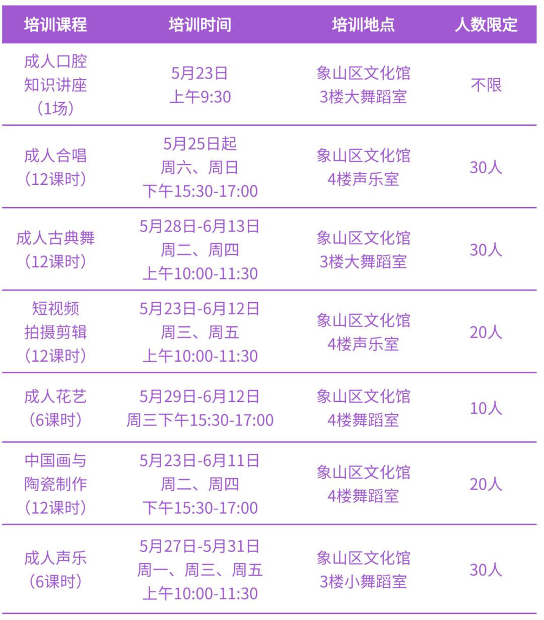 为深入贯彻落实《中华人民共和国公共文化服务保障法》,切实保障人民群众基本文化权益,丰富人民群众精神文化生活,培育和践行社会主义核心价值观,营造全民参与艺术普及的良好氛围,桂林市象山区文化馆即将开展“文兴广西·艺术有约”5·23桂林市象山区全民艺术普及月暨文化服务宣传周公益培训活动。