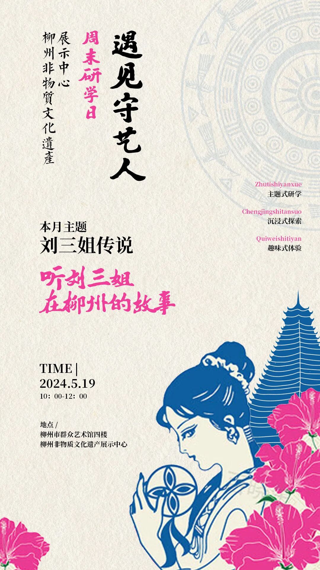 本期“遇见守艺人”将以现场交流的形式,邀请民俗专家分享刘三姐传说故事和相关收藏,展示妙语连珠的柳州山歌即兴对唱,全方位沉浸式感受山歌魅力。参加本次活动的市民均可获得“刘三姐传说”限定集章册一本,盖“歌仙刘三姐”主题限定章。课程中互动环节还将有小福利放送!