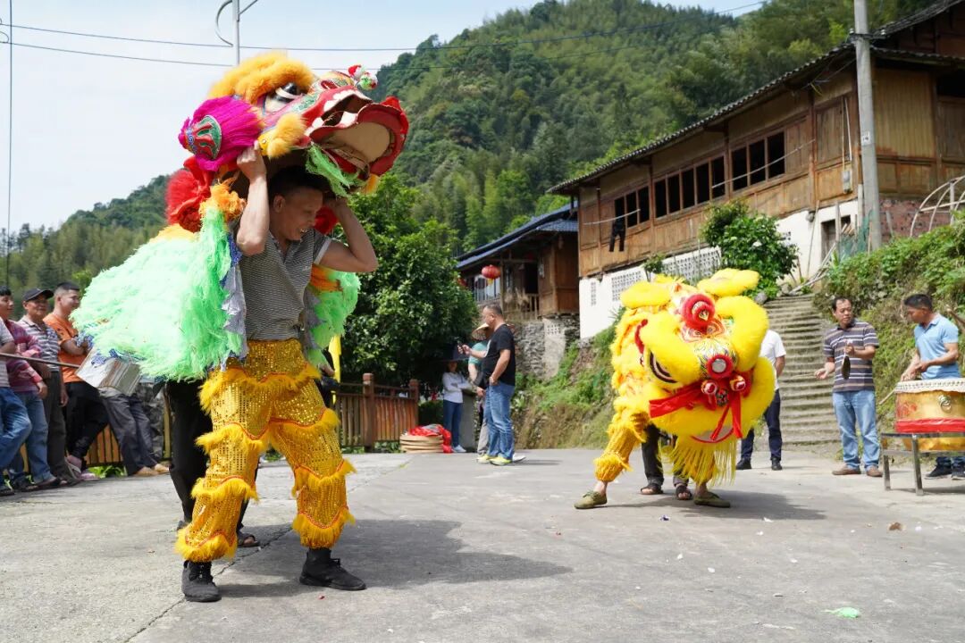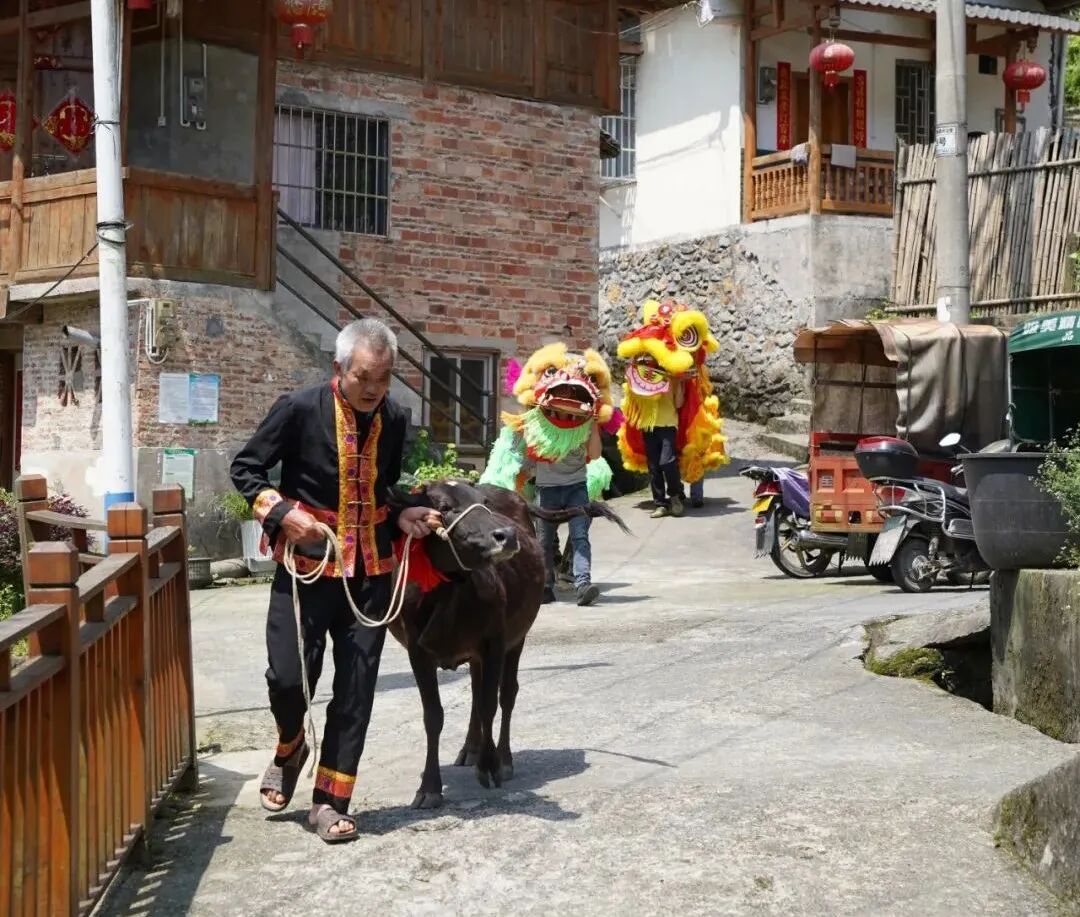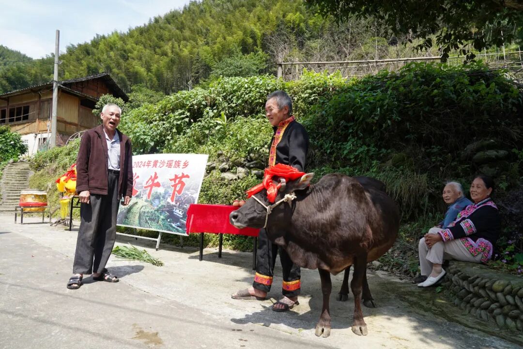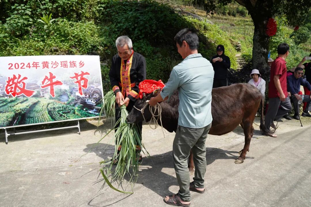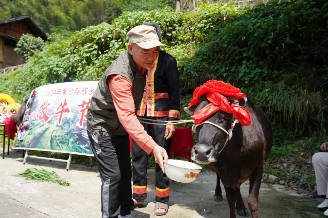 敬牛仪式开始,由村子里的德高望重的老人点燃香火,喂牛喝水吃草,吟唱敬牛歌,以此感谢牛这一年的辛勤付出。随后开始舞狮表演,由老人牵着牛绕着村寨巡回一圈,保佑村子今年五谷丰登,兴旺繁盛。敬牛仪式结束后,组织游客与村里瑶族同胞一起采摘野菜,共同体验农家生活,中午则一起体验黄沙特色美食。