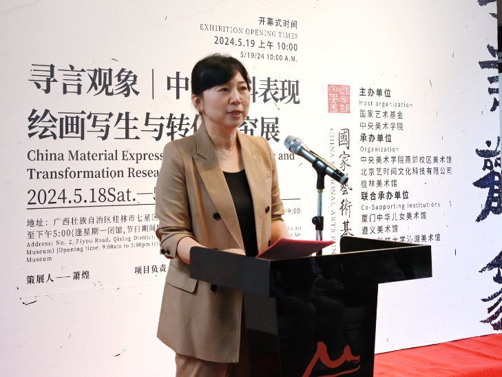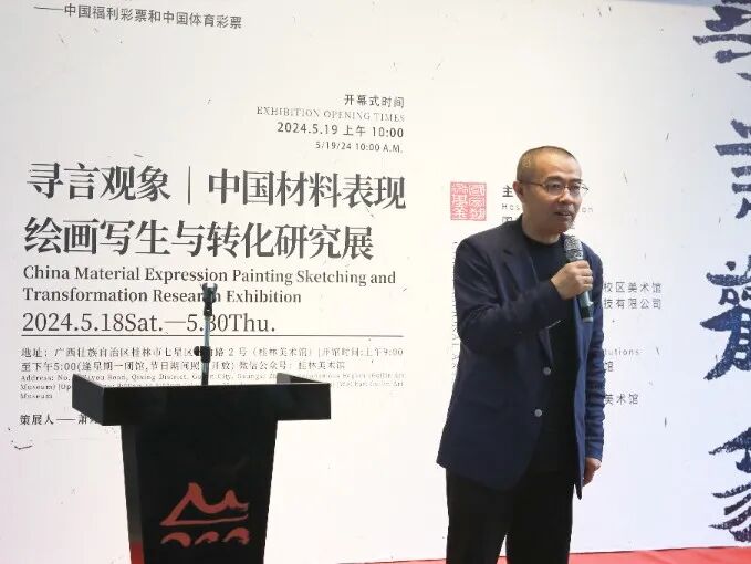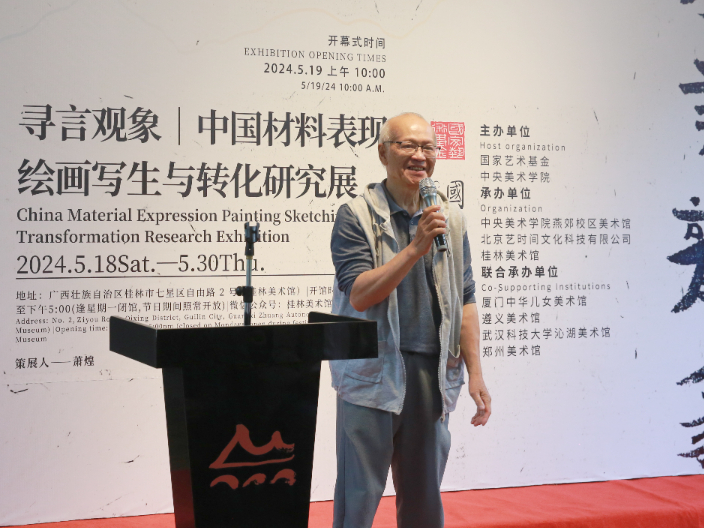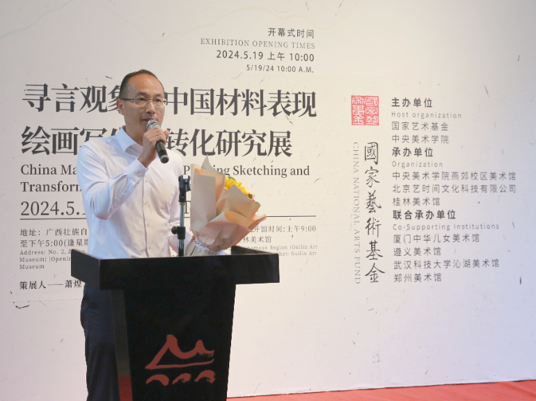 2024年5月19日上午10点,由国家艺术基金、中央美术学院主办,中央美术学院燕郊校区美术馆、北京艺时间科技有限公司、桂林美术馆承办,2024 年度国家艺术基金传播交流推广资助项目《寻言观象——中国材料表现绘画写生与转化研究展》开幕仪式在桂林美术馆举行。主承办方代表、来自全国的业内专家学者、参展艺术家代表及媒体朋友们参与了此次展览开幕活动。