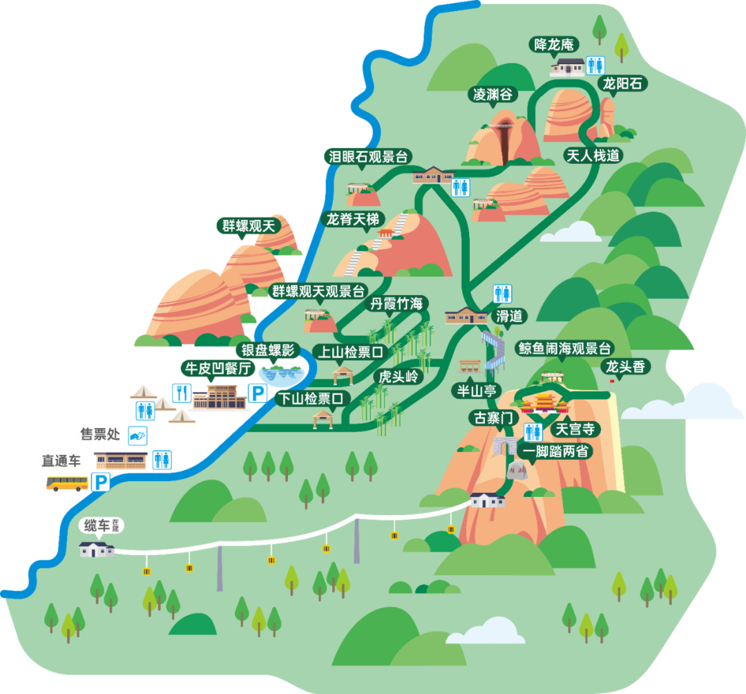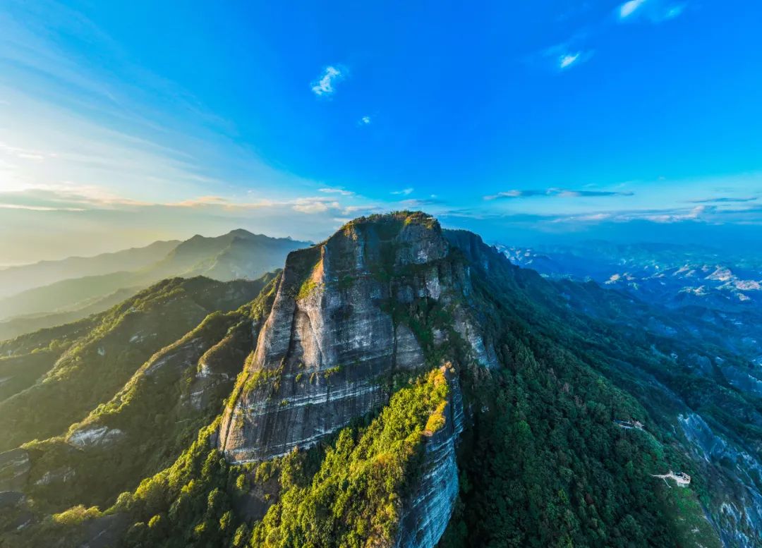 八角寨景观资源丰富独特,地质地貌鬼斧神工,其中以群螺观天、龙脊天梯、凌渊谷、鲸鱼闹海等为绝胜,是登山瞰丹霞风光的好去处。