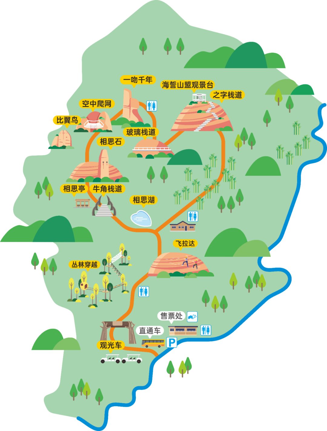 古木冲景区以丹霞地貌为灵魂,以爱情+户外运动为主题,拥有相思石、一吻千年等十余处鬼斧神工的自然奇观;运动以体验无动力设施为主,包括丛林穿越、飞拉达、空中爬网、玻璃栈道等。