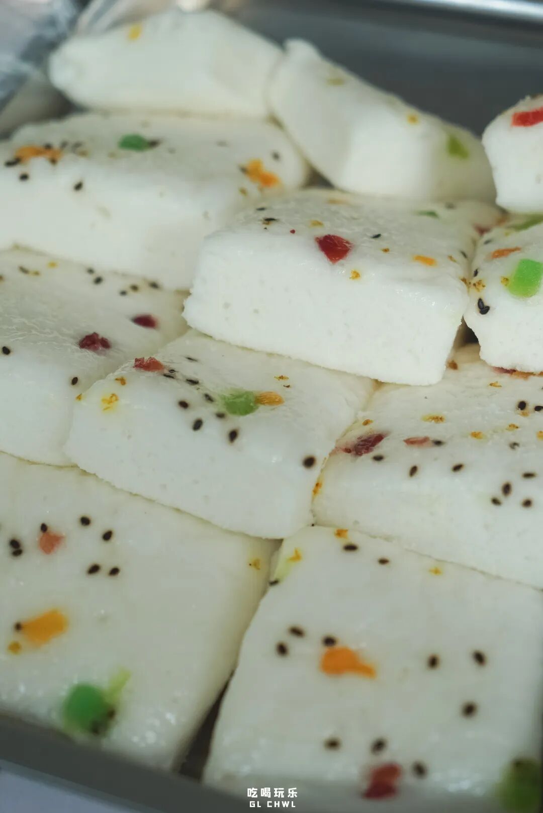 绵绵糕分两种口味,原味和红糖味。原味有芝麻、巧克力彩针点缀,更添香甜;红糖味当然是红枣来点缀啦,每一个小棉花糕上都有几粒红枣碎。