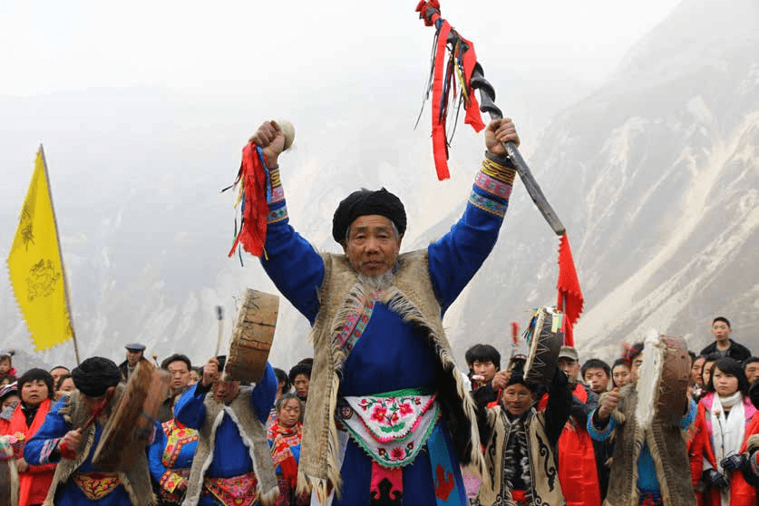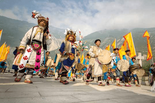 著名摄影家高屯子曾拍摄过系列羌文化影像作品,其中有一张释比独自在山顶击鼓舞动的背影。照片经过灰度处理,天色与山色仿佛接连在一起,没有分际线,也没有别的多余的事物存在,只有释比兀立……画面寂静,却又清晰地回荡着鼓声、诵经声……