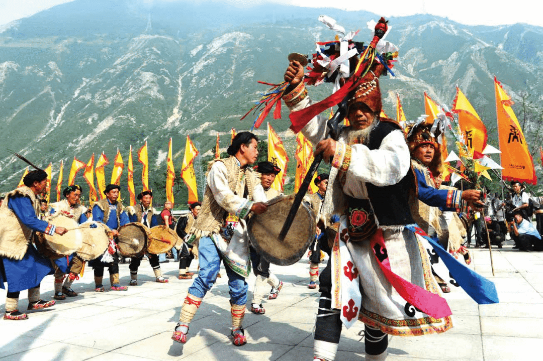神阿爸木比塔家中卜师兼祭司)从天上带下凡来,最初为双面鼓,因在山上一觉睡了许多年,醒来时放在地上的鼓,挨地的一面已经朽坏,于是羊皮鼓成了单面鼓。每逢春耕之际的“祭山”和农历十月初一的羌年活动,羌族文化传承人释比头戴金丝猴皮帽、肩扛神棍、手执响盘(铜制盘铃)率羊皮鼓舞队,击鼓而跳。