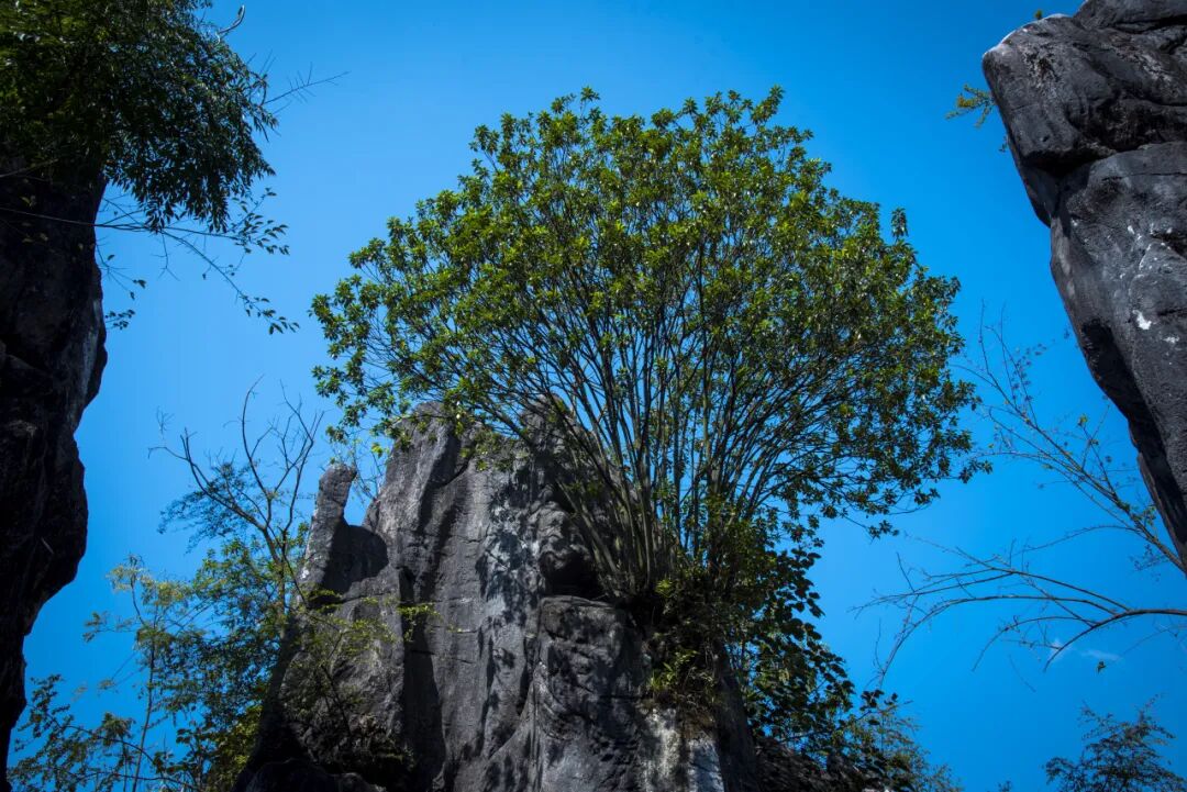 这块石头就像美丽的孔雀正在翘首回望,它身后的这棵半圆形的树,像不像是孔雀开屏在向我们炫耀呀?