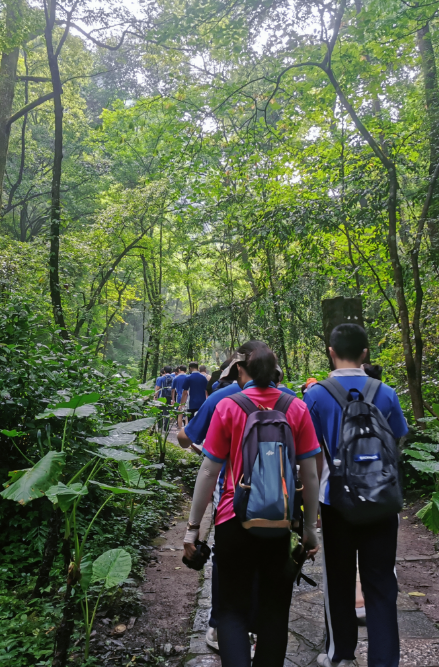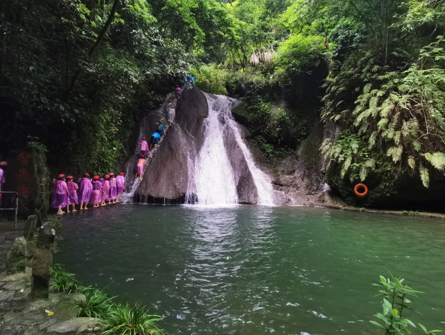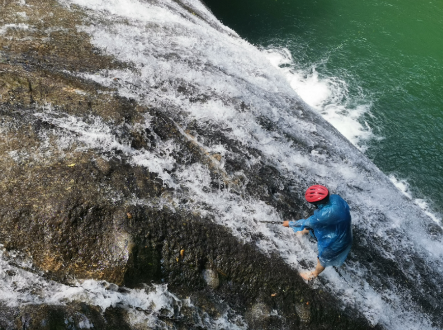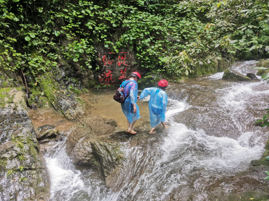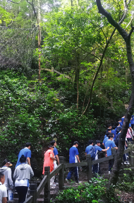 同学们来到古东多级串连的瀑布群中,感受流水对岩石的侵蚀而形态各异的瀑布,沉浸式体验自然地貌的魅力。