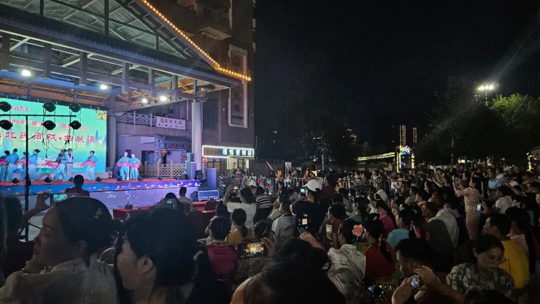 “哪子咿嚯嗨,哪子咿嚯嗨……”5月25日19时30分,临桂枫林广场上,伴随着调胡(也叫大筒,类似二胡)、扬琴、琵琶等乐器响起欢快的曲调,锣鼓奏响节奏鲜明的鼓点,一声极具特色的彩调开嗓曲,拉开了2024年桂北民间戏曲展演的帷幕。临桂本地的国家级演唱艺术家苏庆学第一个登场,一曲《唱起彩调迎客来》将现场的气氛带向高潮。临桂区荣山艺术团节目,彩调版《梁祝》,给原本就凄美的爱情故事,增添了桂林彩调独有的特色,获得现场市民的阵阵掌声;永福县永福镇文艺队节目《又见干妹》充分发挥了彩调的欢乐属性,独特的唱腔,配合嬉笑怒骂的剧情,把现场观众逗得哈哈大笑;来自柳州市柳江区莲花彩调文艺队表演的《姐妹看花》,演员们以精湛的表演,让现场观众沉浸其中;河池市宜州区彩调学会艺术团节目《红军旗帜高高飘扬》,把传统的彩调和宜州当地另一项非遗传承项目“宜州渔鼓”进行了整合,风格创新让节目特色十足……台下,观看演出的市民差不多把枫林广场占掉了一大半,围绕着舞台里三层外三层站着;为了更好观看演出,一些市民从附近饭店借来凳子站在上面,还有人爬上附近建筑的二楼从窗台眺望。