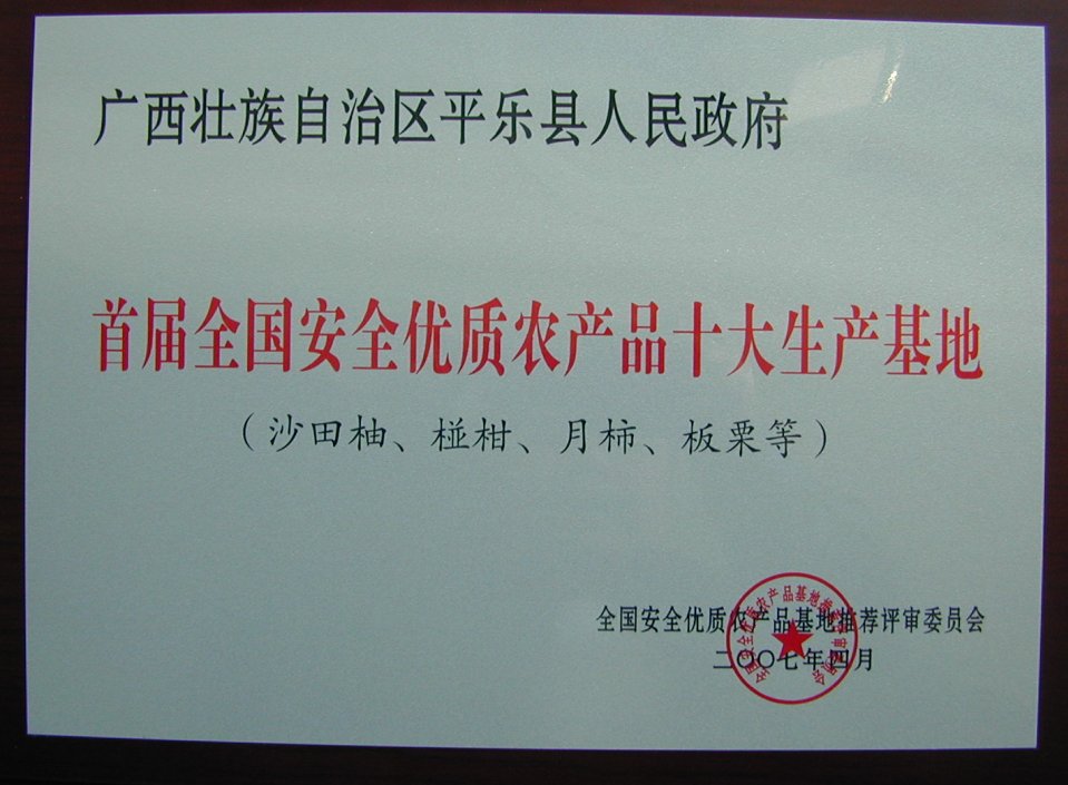 沙田柚在平乐县具有悠久的栽培生产历史,平乐县生产的沙田柚果实呈梨形或葫芦形,果面光滑,果色橙黄,顶部有金钱印,具有果肉晶莹透明、清甜爽口、脆嫩化渣、富香气等特点;果品极耐贮藏,贮藏后风味浓郁,有“天然罐头”之美誉。