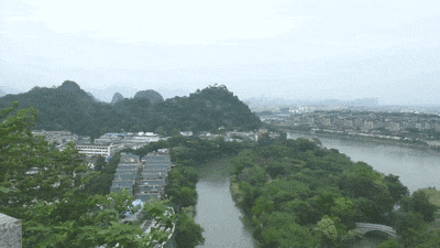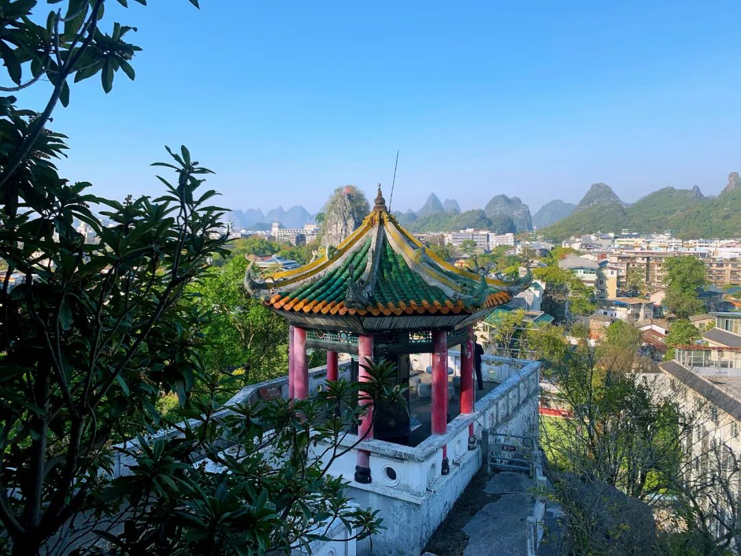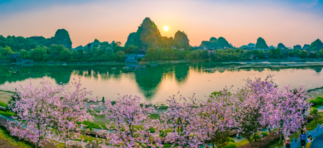 叠彩山因古文“山以石纹横布,彩翠相间,若叠彩然”而得名。娇艳欲滴的各色小花在山崖的石缝中野蛮生长,屋顶上还长出一片粉色的“花田”。登上明月峰可看见遥相对望的伏波山。黄昏时分在仙鹤洞可欣赏别样风景,层峦叠嶂的山被落日镀上一层金光,许多游客在洞口拍摄逆光剪影照片。