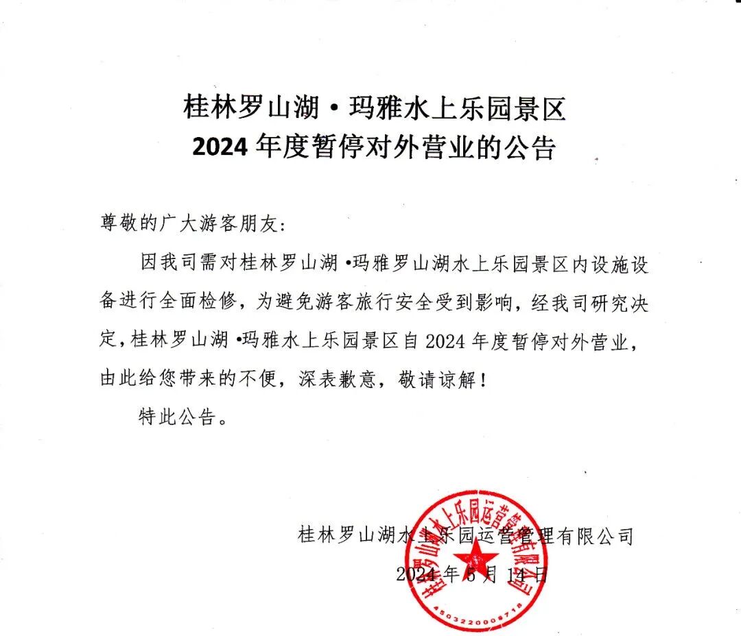 后来,万达、万象城、客世界等等新商业中心如雨后春笋般出现,联达广场的流量自然受了影响,1001乐园的风光自然也不可同日而语。大概在2021年,联达1001游乐园进行了全新的升级,面积大概40000+㎡,有近20种大型游乐项目。不过我们去时,可能由于是工作日,整个乐园里寥寥数人。羽毛球馆、溜冰场都是关着门的,大概是周末有课的时候才会开放。小时候与小伙伴玩过的鬼屋已经关闭,记得那时候胆子小,被工作人员扮的“鬼”出来抓脚,吓得哇哇大叫,现在回想起来,令人感慨万千。当时号称整体斥资60亿,全力打造"桂林罗山湖国际生态岛"项目。"罗山湖水上乐园"便是这个项目第一期。罗山湖水上乐园,占地近400亩,距市区25公里、临桂区市区15公里,仅距桂林两江国际机场2公里。整个水上乐园涵盖15个大型设备,及多个国内最先进的水上乐园系统设备,总体划分为宝贝水域亲子活动区,山地滑水探险区,冲浪漂流休闲区,其中亲子活动区面积为20000+㎡。在融创水世界入驻桂林之前,“罗山湖”和“玉圭园”可谓平分秋色,桂林人想要玩水,就是这两个之中取其一。可就是这么一个每年夏季,不少桂林人都会“奔赴”的大型水上乐园,在今年5月14日宣布,暂停营业!5月14日,桂林罗山湖水上乐园运营管理有限公司发布了一则公告,具体内容如下:在罗山湖宣布暂停营业后,有人表示惋惜、有人觉得必然,众说纷纭,无法辨对错,但是属于一代桂林人的水上乐园记忆,也就此尘封了。