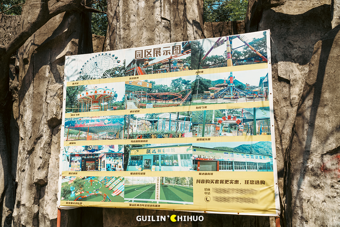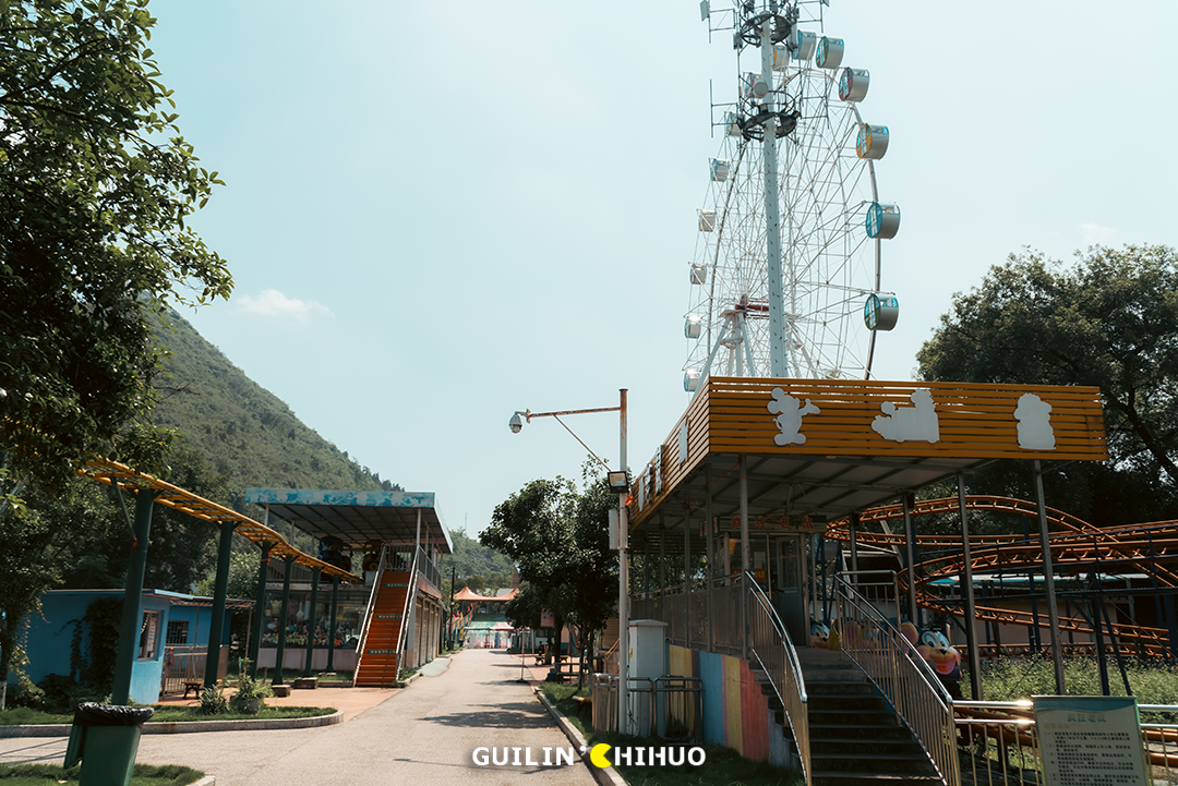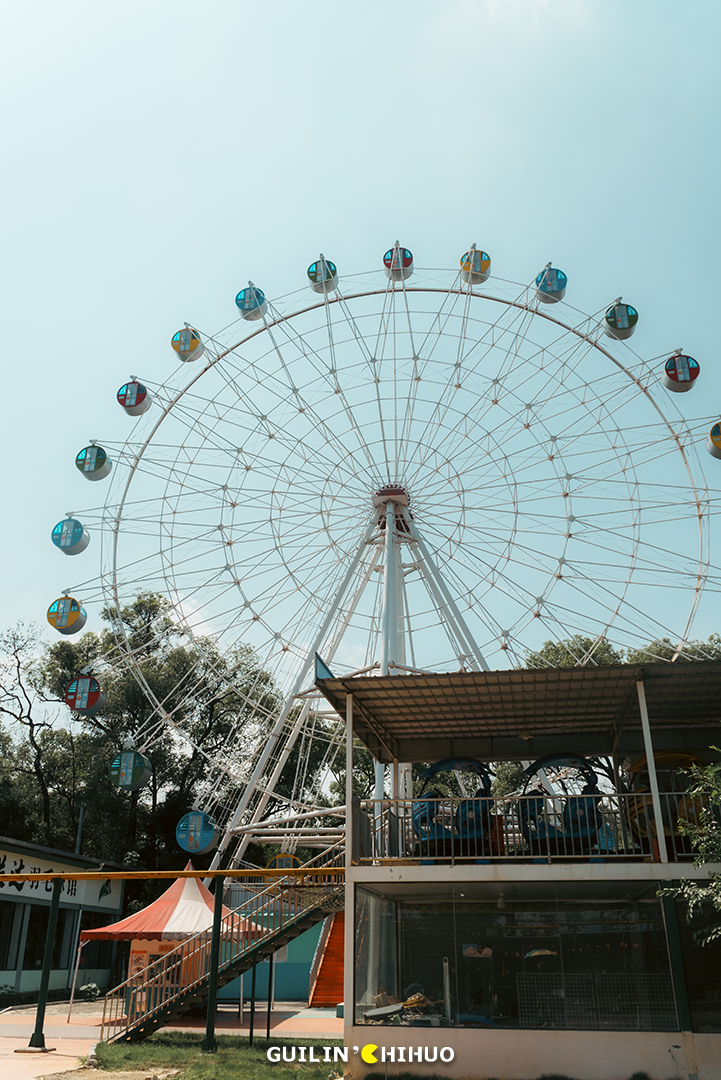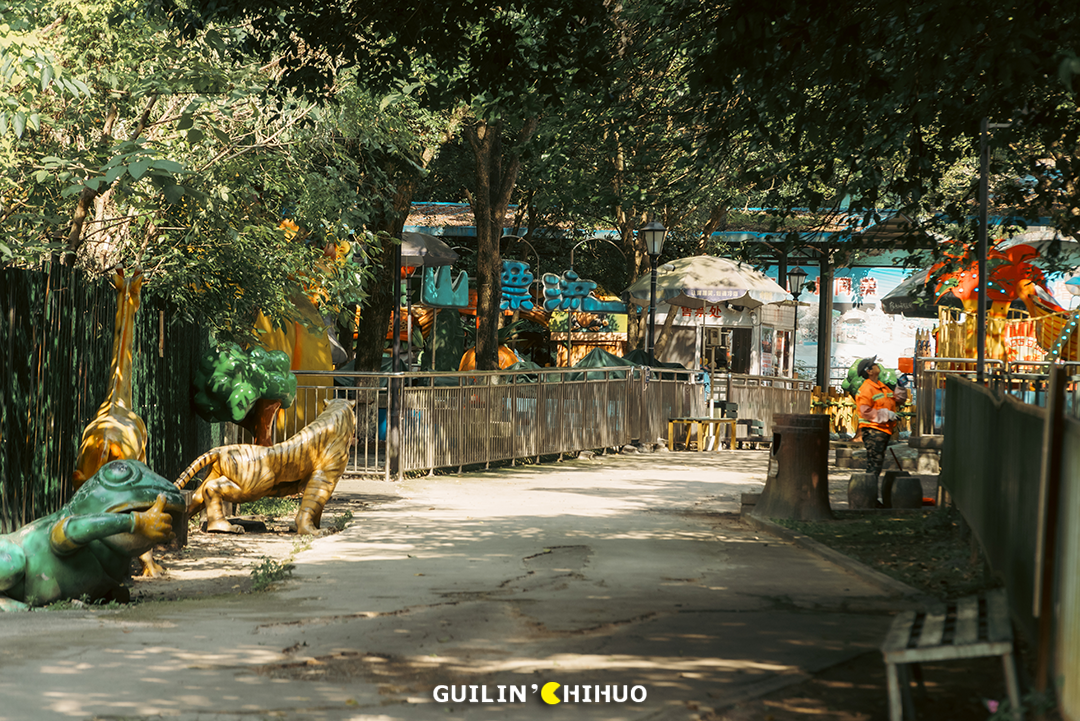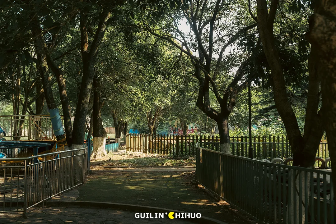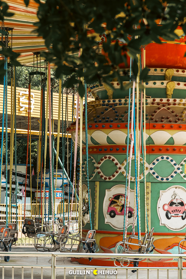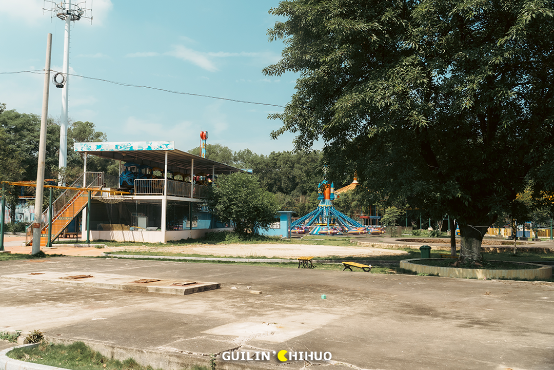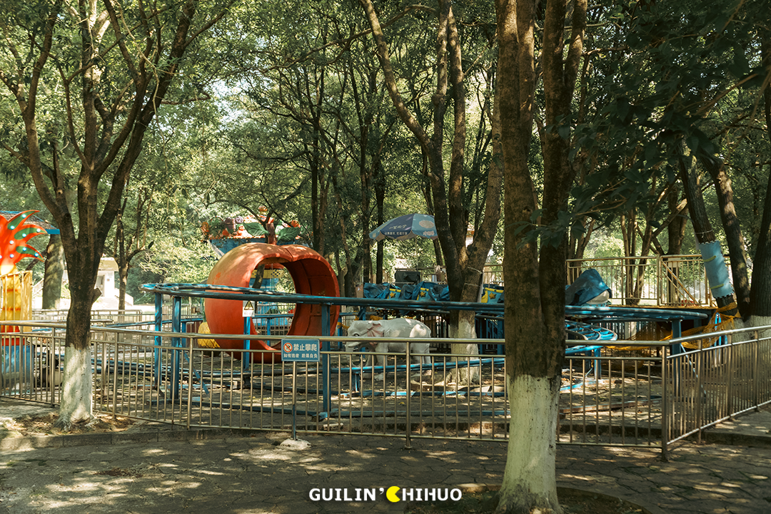 犹记得小时候,那个玩法略显匮乏的年代,能被爸妈带着去七星公园、1001玩一天,那可是可以回学校和同学“吹”上好多天的。还有万年不变的乐满地春秋游,有多少人和我一样,去玩的头一天晚上就兴奋得睡不着了。我们总说,对于桂林人来说,没来过这几家游乐场,童年就不算完整,现在,玩过的人怕是都已经为人父为人母了吧!时光不经用,有些事物如果不能留住,那就留下回忆也是好的,这些游乐园,承载了一代桂林人的儿时回忆,也成为了一代桂林人专属的“童年快乐”。未来,这些游乐场是否会彻底消失,成为一代桂林人的独有记忆?七星公园儿童乐园(七星欢乐园),不必过多介绍,老桂林都懂的一个地方。毫不夸张地说,在上个世纪70—90年代,几乎每个桂林人小时候都去玩过。或者跟着爸妈去,或是学校组织的春秋游,无论何种形式,这里都承载了无数个欢乐的周末。小时候的我们,总觉得游乐场很大,玩不完、玩不腻,就单说那个碰碰车的场地,就感觉宽敞得撞不上人家。其实长大后细细想来,说是游乐场,其实里面总共也就十来个游乐设施,印象深刻的就是旋转木马、碰碰车、激流勇进、小火车等等。2011年后,七星公园的老儿童乐园停止营业,那个陪伴了无数桂林人童年时期的游乐园,从此画上了句号。小火车之地已是杂草丛生,旋转木马不见了,激流勇进不见了,滑滑梯也不见了,就连那架极具代表性的米格-15飞机,如今也已没了身影。去时正值午后,阳光正好,游乐场里却只有两三人,部分游乐设施还是开放的,不过非常少,加起来不过二三个。