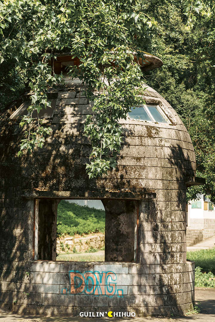 圆柱形楼体、拱形的门窗、斑驳的墙体、随意的涂鸦,加上肆意生长地藤蔓,整体就像童话里的幽森城堡,别有另一番意境。