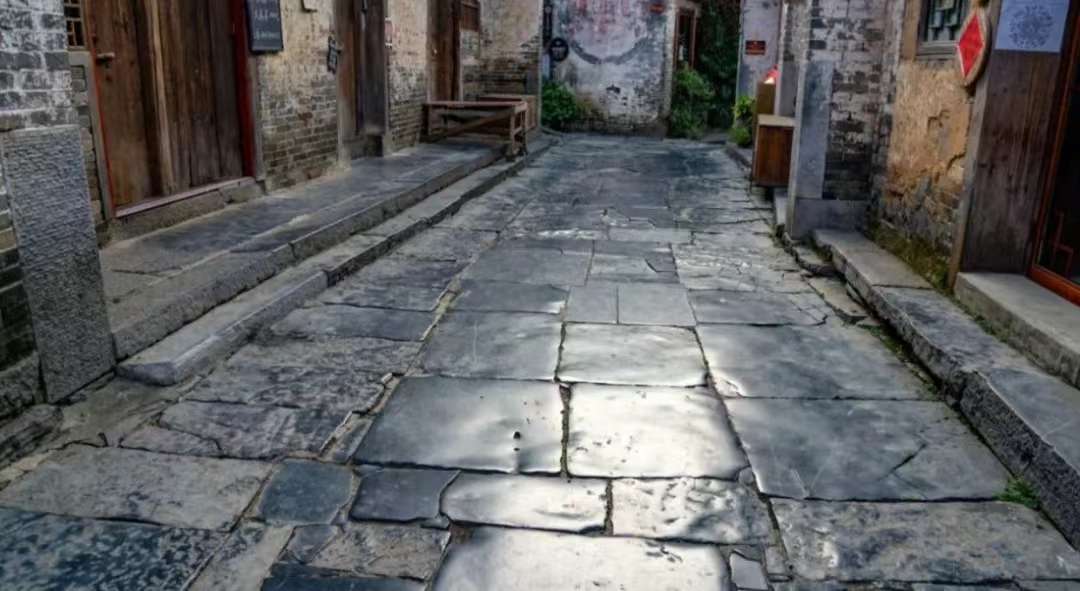 青石板街,铺砌于清朝顺治年间。古镇内共有主街8条,总长约3公里,石板之间不用任何粘合物,全靠准确的尺寸,牢牢地拼接在一起,每条街的下方都布有相互连通的排水道,雨水便沿着排水道排出古镇。街道与街道之间均为丁字路口,寓意丁财两旺。青石板街的构造工艺充分体现了工匠们独具匠心的聪明与才智,被誉为黄姚一绝。