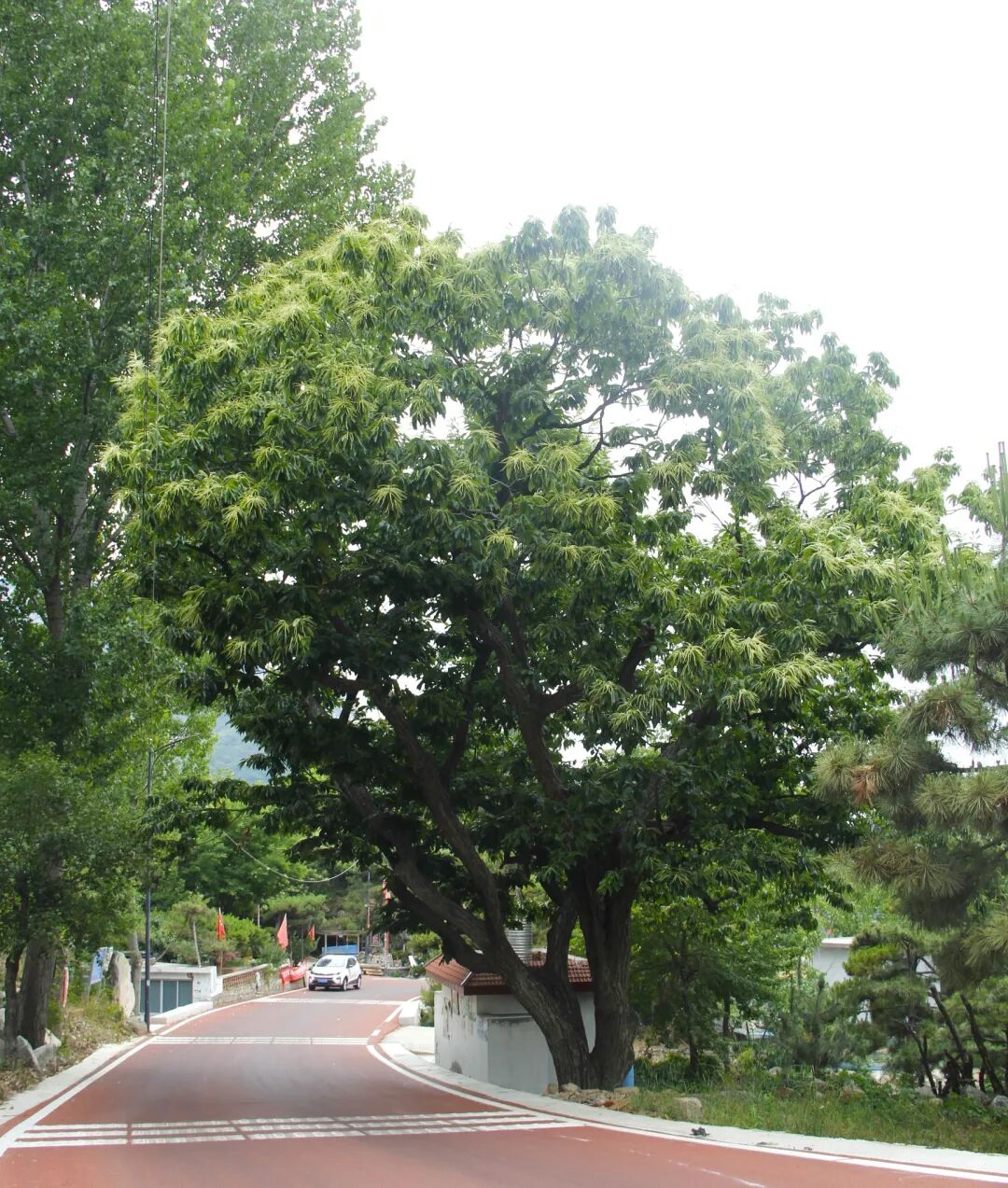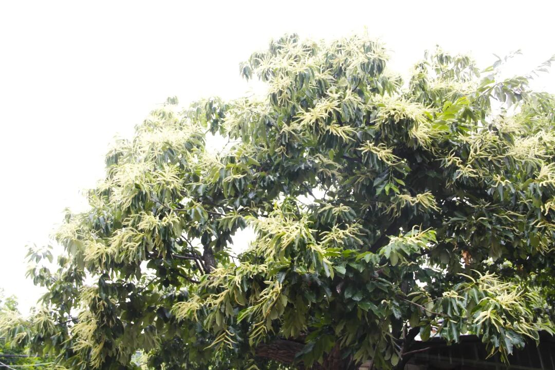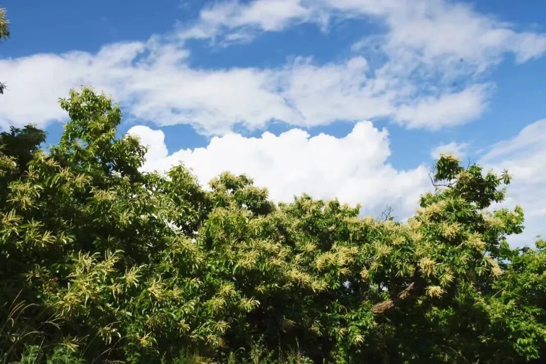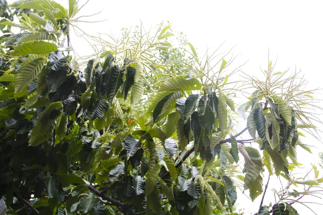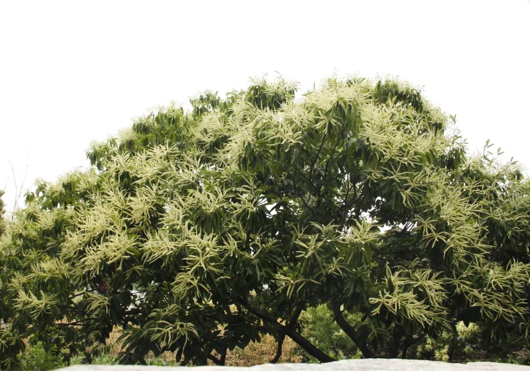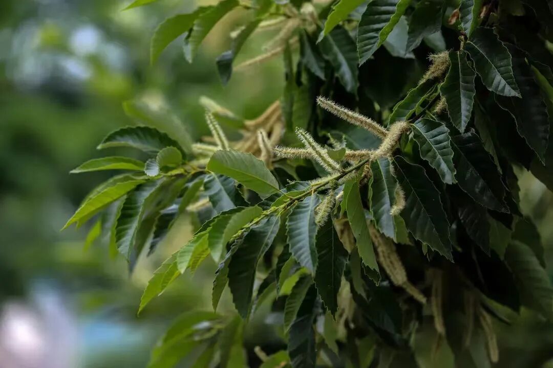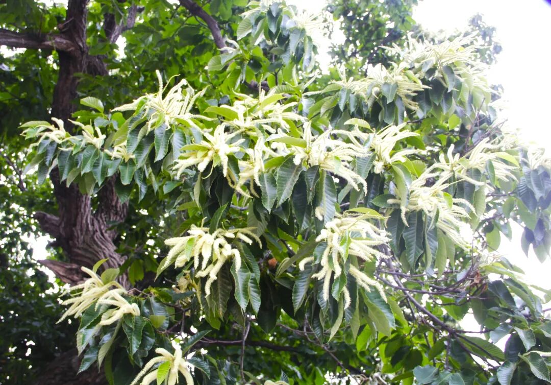 板栗花花轴细弱,呈穗状,像是夜空中绽放的礼花。板栗花分为雌花和雄花。雌花序为聚伞花序,雄花序为长条状,一般每个雄花有小花600~900朵。板栗花初花期为绿色,盛花期则变为淡淡的米黄色。花期较长,从初花期到败花期大约有一个月的时间,5月中旬至6月中旬是板栗花盛放的时节。