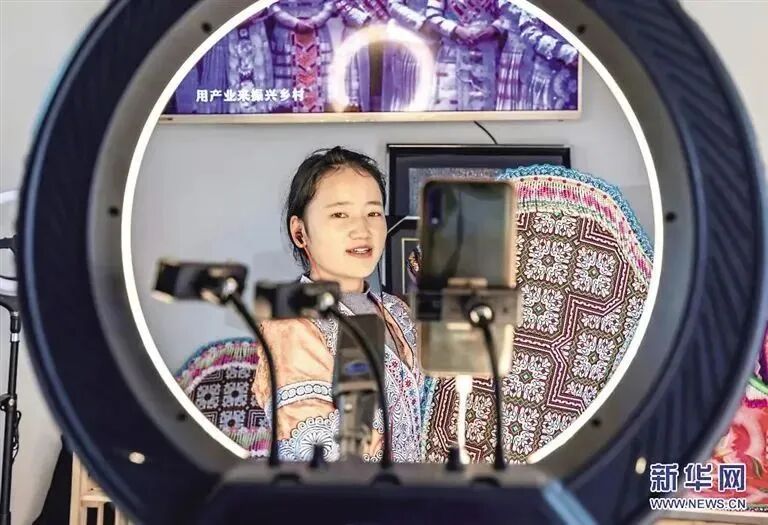 ▲贵州省毕节市黔西市新仁苗族乡化屋村村民在带货直播时推介苗绣产品。(新华社发)