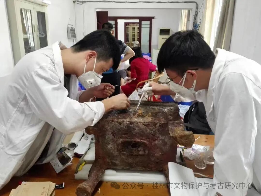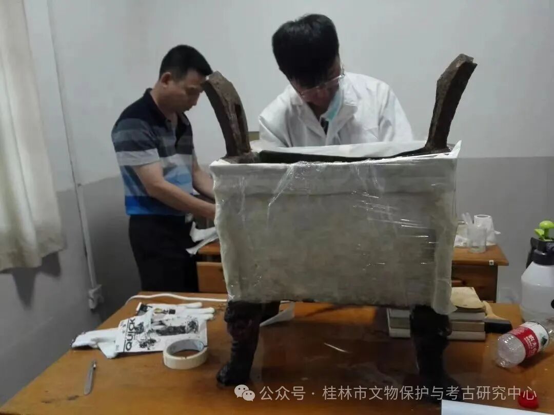 对这个铁香炉进行出土拍照测量后,其第一时间被运往桂林市文物工作队(今桂林市文物保护与考古研究中心)文物库房进行妥善保管。直至2015年5月,在修复技术条件成熟后,桂林市文物工作队委托广西文物保护与考古研究所专家团队对其进行除锈、修复和保护等工作。