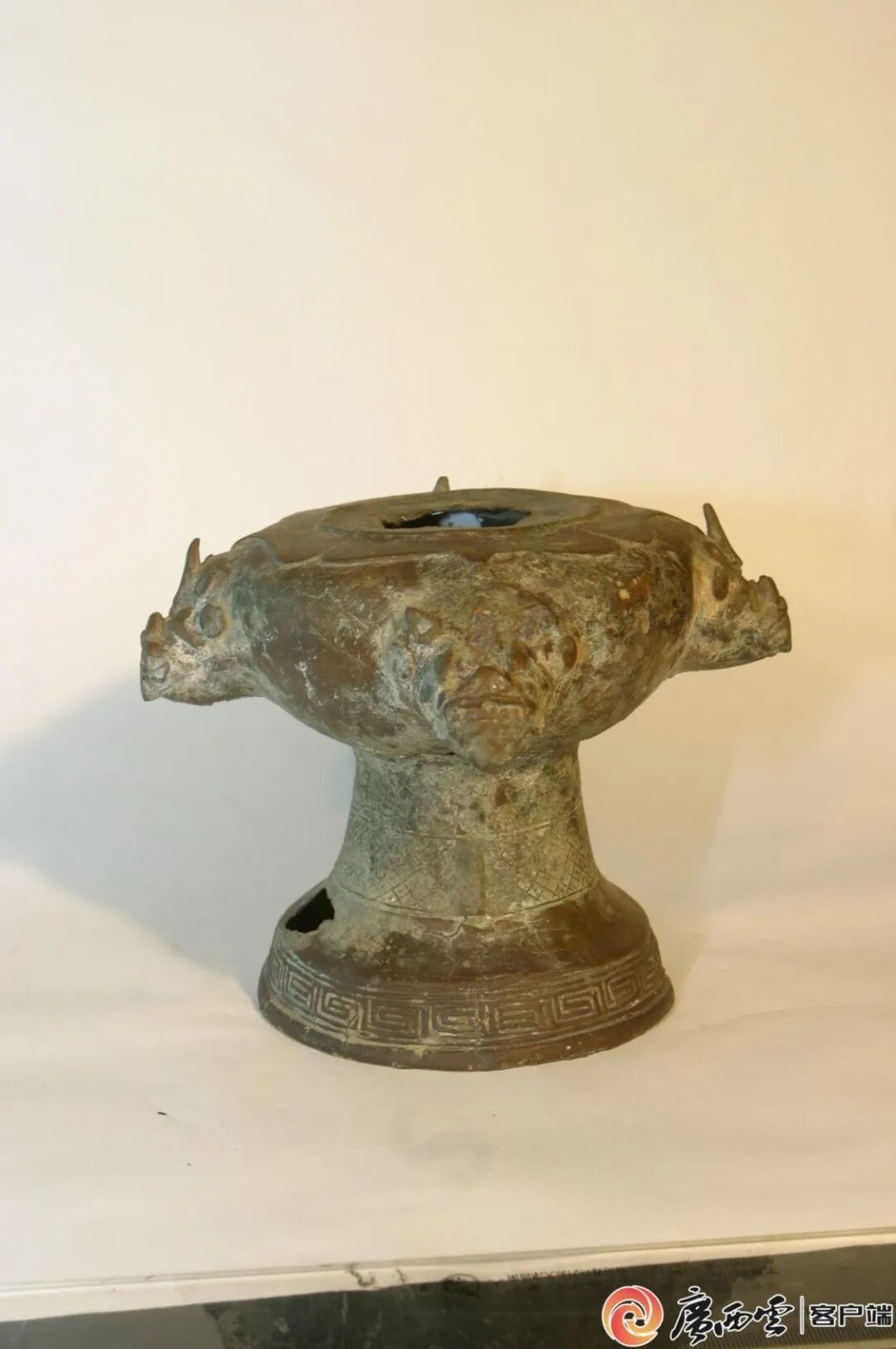 明代四犀牛首饰鼓形铜器。1964年在柳州市小南路棉纱纺织公司小南门市部挖地下室时,于十米深处出土。柳州市博物馆供图