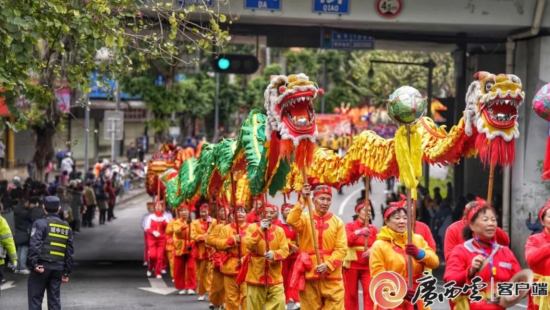 2024年元宵节,柳州市城中区群众舞龙舞狮参加传统的“龙王出游”非遗民俗活动。图为途经曙光西路历史文化街区的场景。唐绍怡 摄