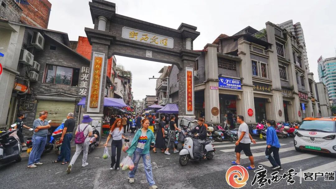曙光西路历史文化街区的主要街市青云路、小南路,市民、游人络绎不绝,到处都是吆喝声、讨价还价声、老友相互问候声,整个街区热闹又有人情味。在螺蛳粉店和一众网红小吃店门口,众多打扮精致、来自广西乃至全国各地的年轻人早早排起了长队。