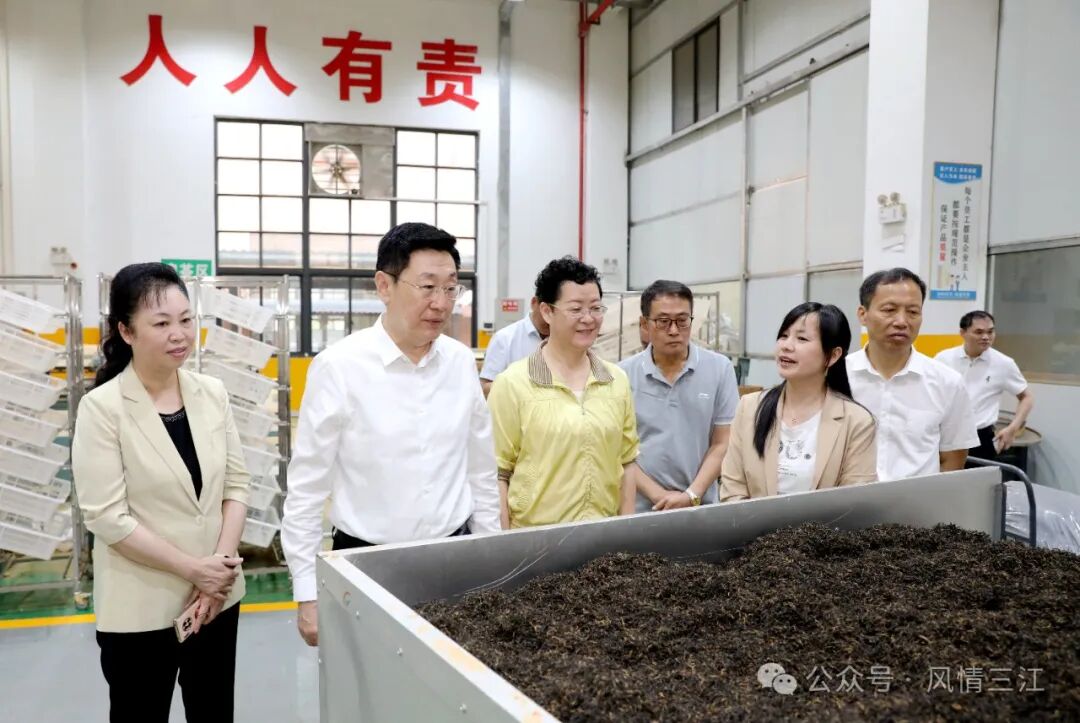 调研中,何辛幸一行还到三江侗族自治县生态产业园御香茶业有限公司茶叶加工车间,深入了解三江茶生产加工、品牌打造、产品销售等情况,希望三江依托生态茶业传统优势、自然优势和资源优势,聚力做全产业链、提升价值链,全力推动三江茶产业高质量发展。