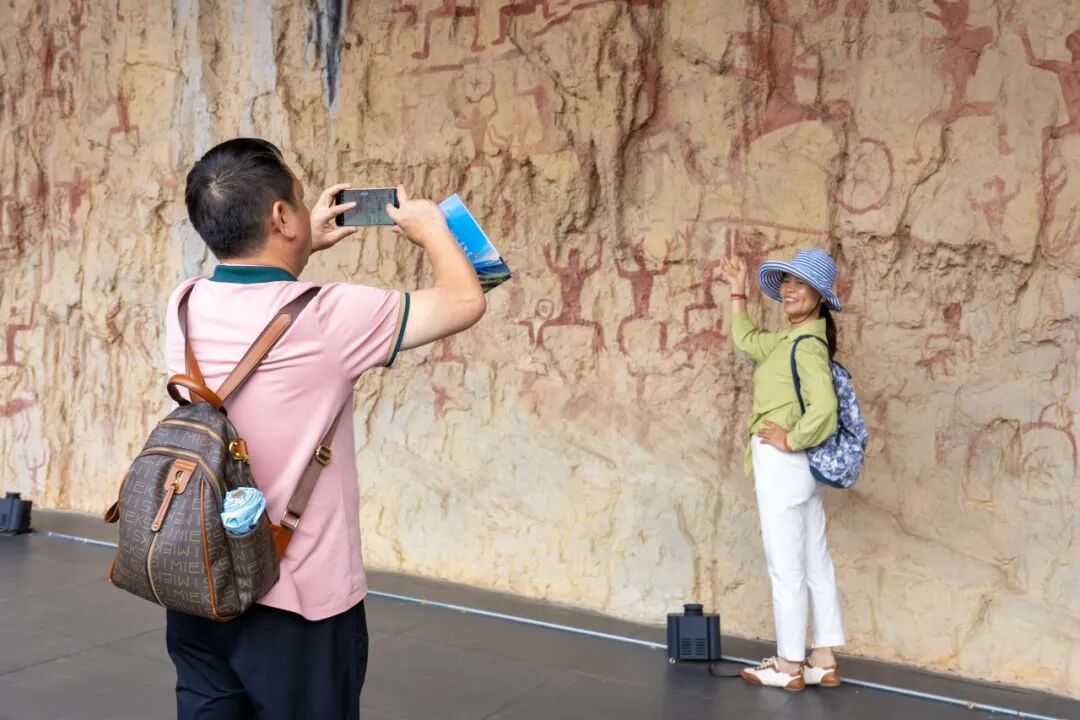 谁懂啊!游客中心外藏着免费出片神器,这面岩画复刻墙太绝了!等比例还原核心区岩画,赭红色的人物和铜鼓图案超清晰,秒变穿越千年的大片主角!小众不挤人,免费还出片,冲就对了~