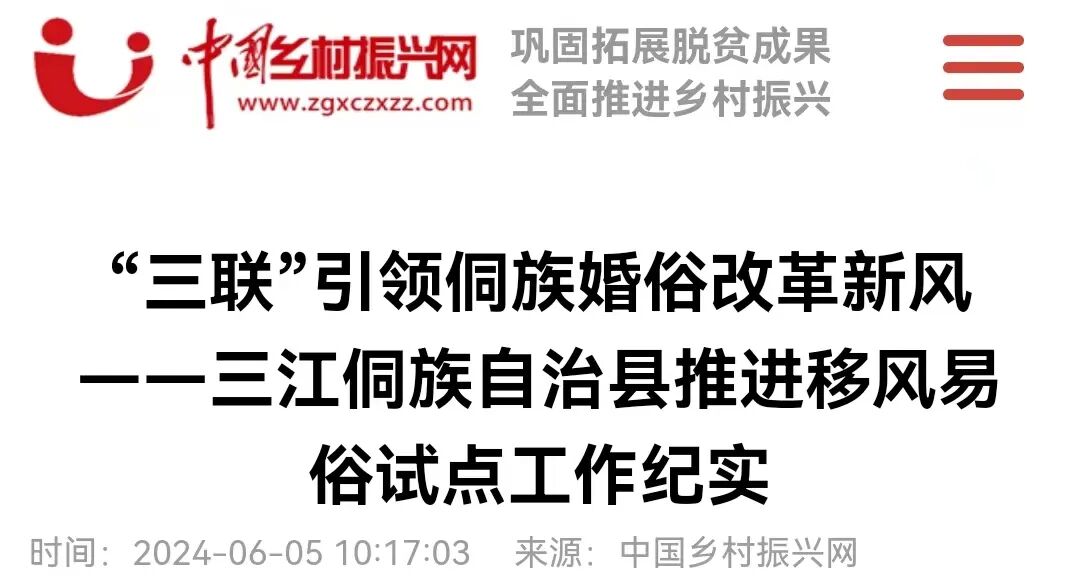 自开展移风易俗试点工作以来,三江侗族自治县聚焦侗族婚俗,通过县、乡、村“三级”联建,自治、德治、善治“三治”联合,侗族文化、汉族传统、现代节庆“三方”联动等措施,以点带面破旧俗、转观念、树新风,积极推进婚俗领域移风易俗,打造桂、湘、黔三省(区)交界处民族婚礼改革样板,形成简约适度、文明健康的婚俗新风,擦亮全县人民高品质生活“幸福底色”,共画民族同心圆,赋能乡村全面振兴。