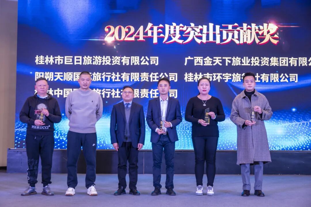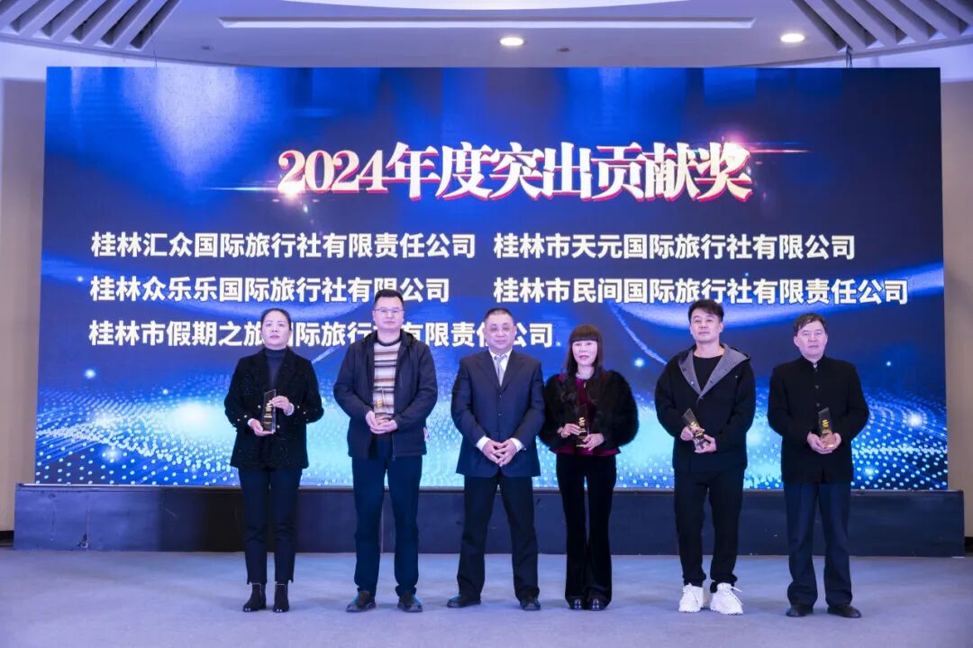 现场各部委办局领导及桂林旅股公司领导,依次为2024年桂林旅股突出贡献合作客户及现场幸运嘉宾颁发奖项和奖品。
