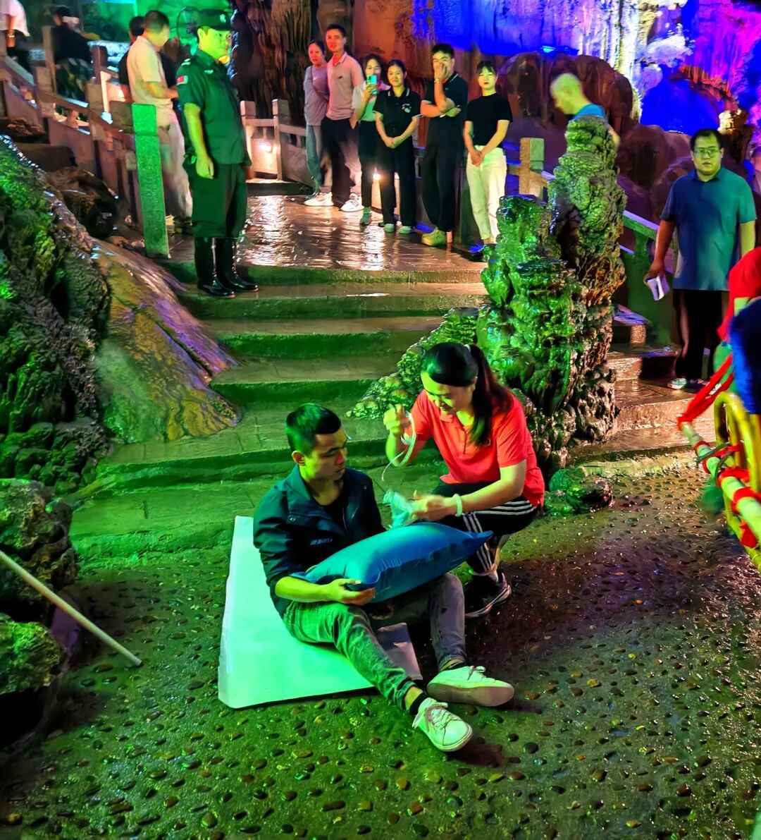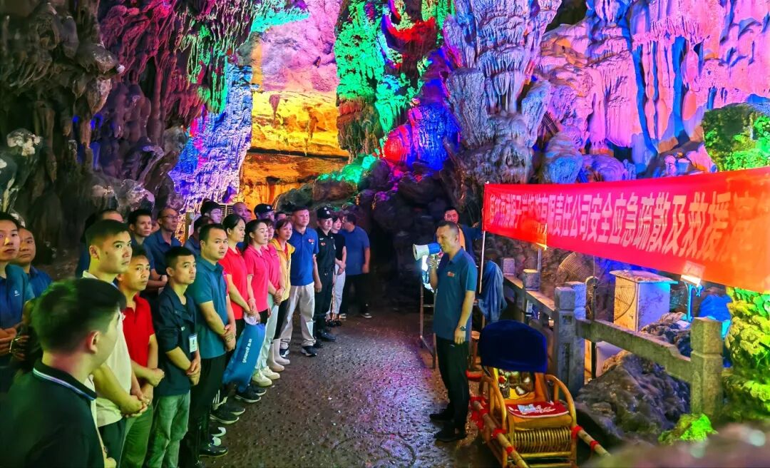 6月18日上午9时,演练人员抵达洞内演练指定地点,依据公司《应急疏散及救援演练方案》开展实地、实操演练。伴随演练指挥人员的一声令下,演练正式开始。先是洞内值班人员发现“神奇双柱”景点处有游客晕倒且出现拥堵状况,工作人员旋即向综合办公室汇报,综合办公室通过公司管理人员微信群通知各部门工作人员进洞实施医疗救护和疏散游客。工作人员抵达现场后,其一,医疗救护人员即刻给晕倒游客进行输氧操作;其二,救援人员用担架将晕倒游客抬出溶洞;其三,疏散人员以事发地点为界,分别将游客从进洞口和出洞口方向予以疏散。20多分钟后,晕倒游客被送上救护车辆前往医院救治,其他游客也被顺利疏散至地球记忆博物馆门口广场。至此,本次演练圆满结束。