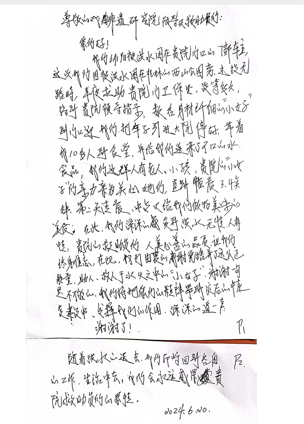 6月20日一早,桂林市戏剧创作研究中心(桂林市非物质文化遗产传承保护中心)(以下简称戏剧中心)收到一封10余人联名书写的感谢信。信中称,受6月19日西山路积水封路的影响,他们被困无处可去,危急时刻,戏剧中心为他们敞开了大门,并提供食物、饮水和休息区,让他们过了一个安定的夜晚。“我们深深地感受到洪水无情人有情,贵院的救助员们人美心善的品质让我们终生难忘。”信中这样说。