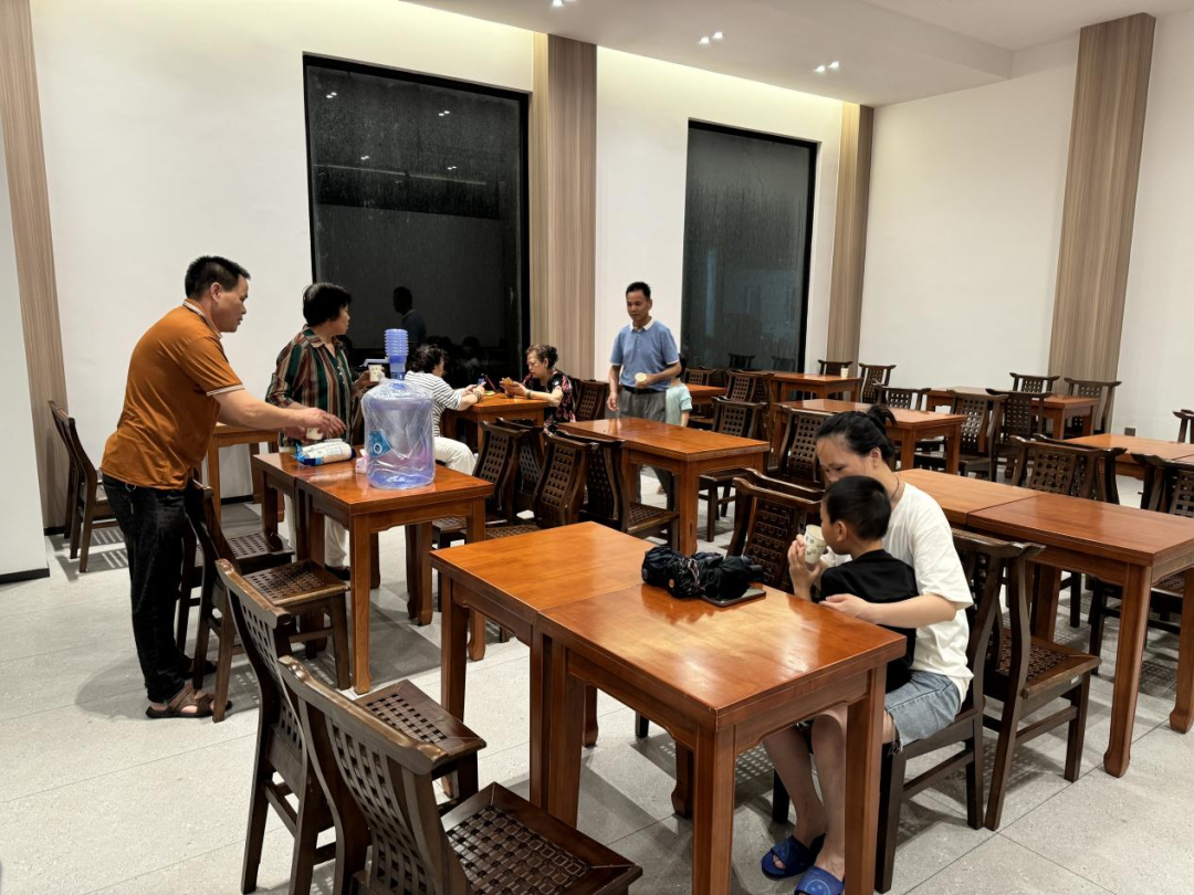 19日晚,受困人员来到戏剧中心食堂休息。(桂林市戏剧创作研究中心供图)