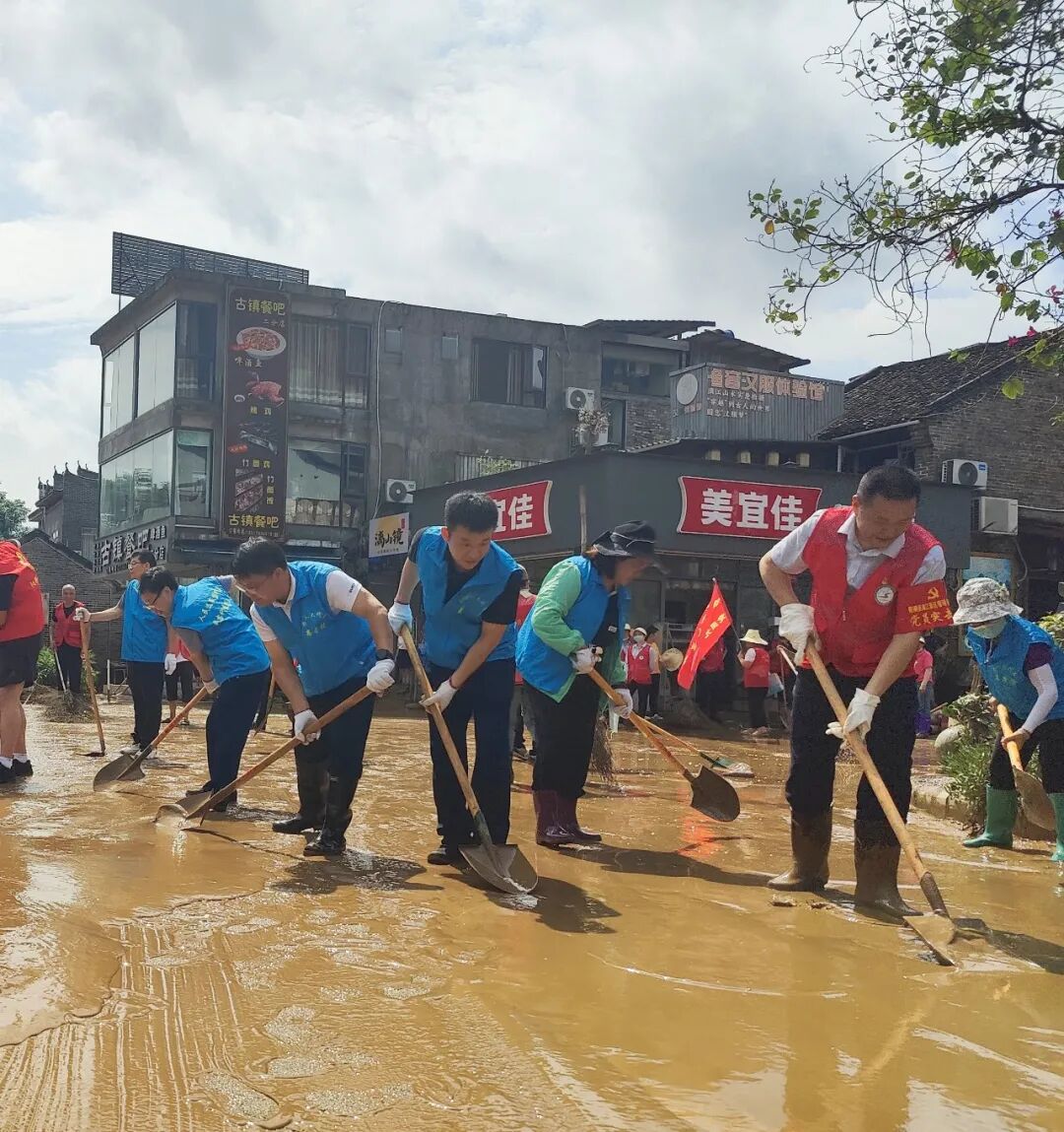 在清淤现场,县领导、人大代表奋战在清淤一线,一抹抹蓝色身影正在热火朝天忙碌着,大家分工明确,通力合作,手持铁锹、高压水枪、扫帚等工具,一寸一寸清理,一米一米推进,铲淤泥、捡垃圾、冲洗地面、扫积水、搬运倒塌的树木和障碍物,帮助群众尽快恢复正常生产生活秩序,创造卫生整洁的生活环境。