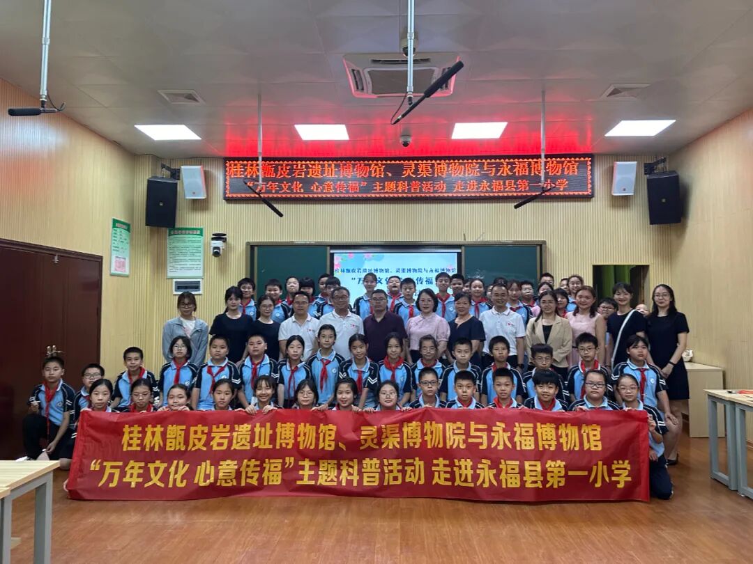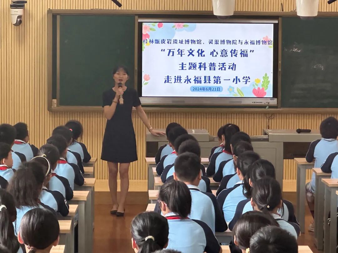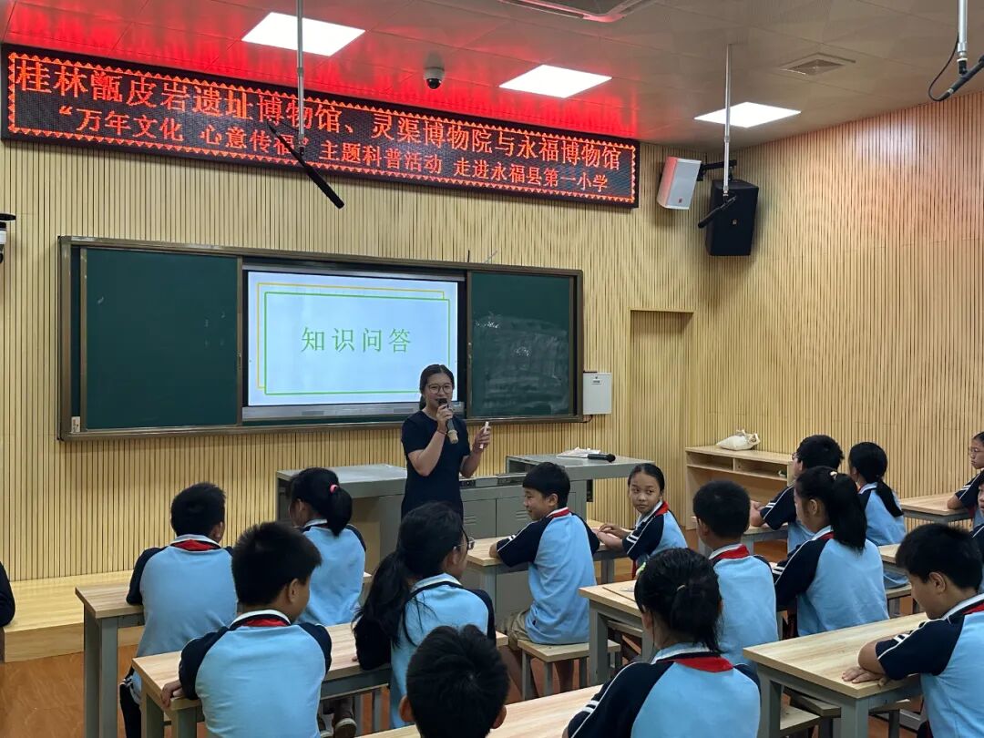 下午,桂林甑皮岩遗址博物馆、灵渠博物院携手与永福博物馆在永福县第一小学开展以“万年文化 心意传福”为主题的科普进校园活动,把甑皮岩遗址丰富又独特的史前文化及考古知识会同灵渠历史知识转化成为科普教育资源输送到永福县校园中。