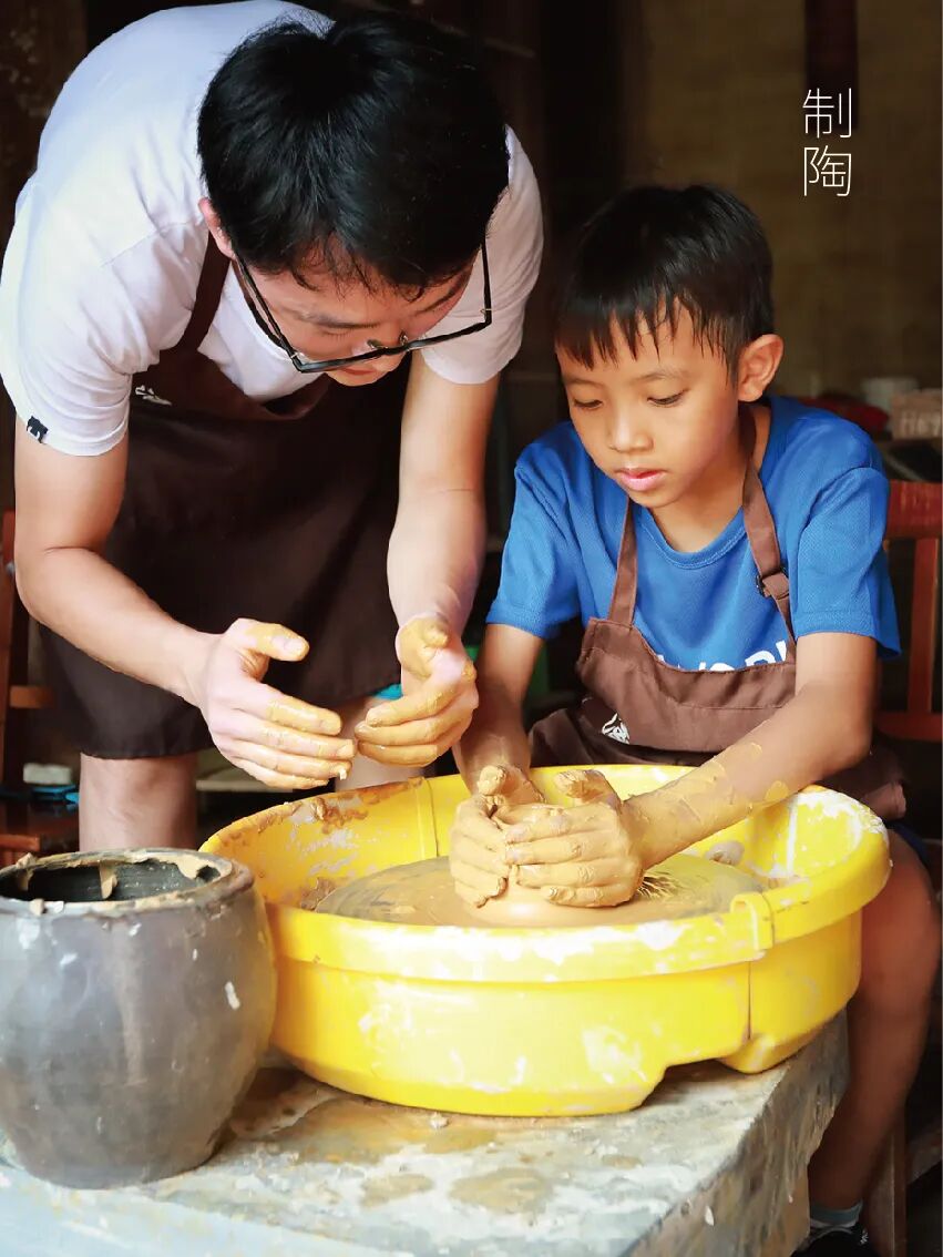 植物染的布料,带着自然的颜色,或是体验一把古法榨油,每一滴山茶油都是时间的味道。在制陶坊,泥巴在手里转啊转,转出了自己的小世界。