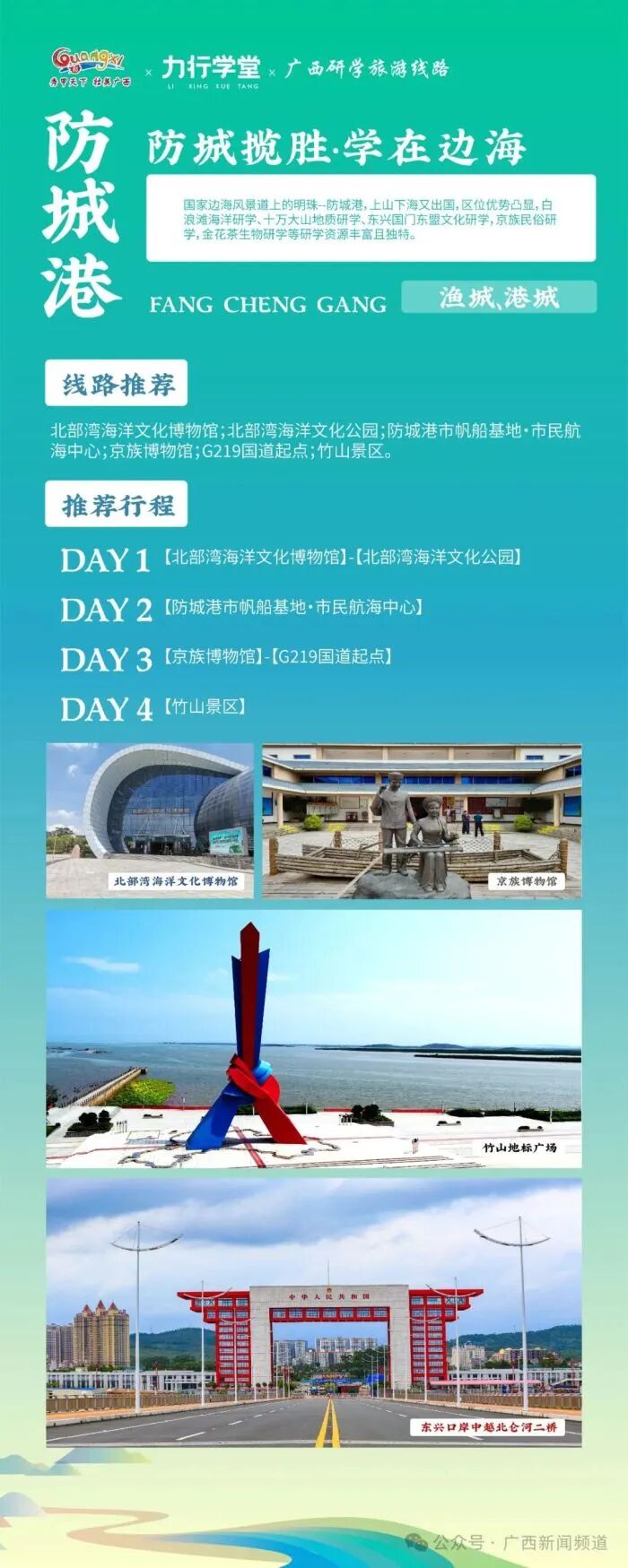 线路推荐:北部湾海洋文化博物馆;北部湾海洋文化公园;防城港市帆船基地·市民航海中心;京族博物馆;G219国道起点;竹山景区。