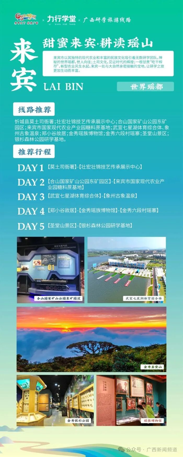 线路推荐:忻城县莫土司衙署;合山国家矿山公园东矿园区;来宾市国家现代农业产业园糖料蔗基地;武宣七星湖体育综合体;象州古象温泉;郑小谷故居;金秀瑶族博物馆;金秀六段村瑶寨;银杉森林公园研学基地。