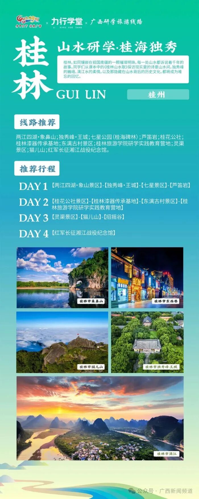 线路推荐:独秀峰·王城;两江四湖·象鼻山;七星公园(桂海碑林);芦笛岩;东漓古村;漆器传承基地;桂林旅游学院研学实践教育营地;桂花公社;兴安县灵渠;猫儿山;全州县湘江战役纪念馆。