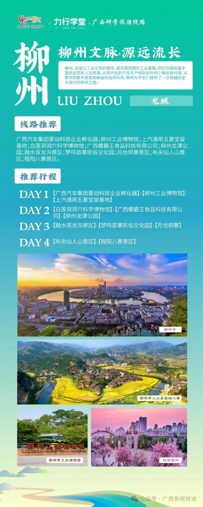线路推荐:广西汽车集团菱动科技企业孵化器;广西螺霸王食品科技有限公司;上汽通用五菱宝骏基地;龙潭公园;柳州工业博物馆;白莲洞洞穴科学博物馆;融水苗族自治县双龙沟景区;三江侗族自治县程阳八寨景区;布央仙人山景区;月也侗寨景区。