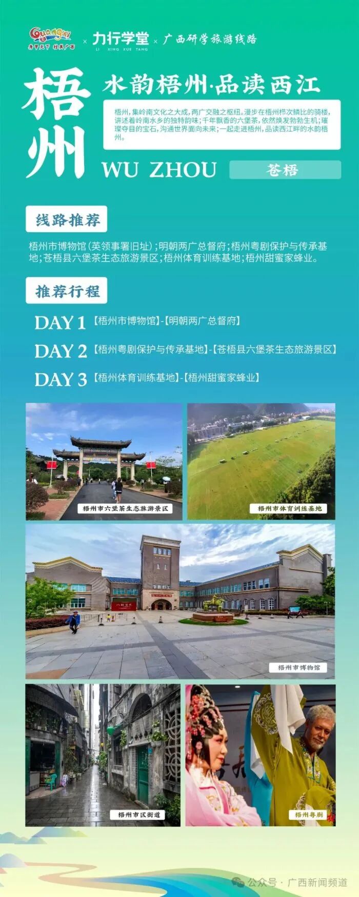 线路推荐:梧州市博物馆(英领事署旧址);明朝两广总督府;梧州粤剧保护与传承基地;苍梧县六堡茶生态旅游景区;梧州体育训练基地;梧州甜蜜家蜂业。