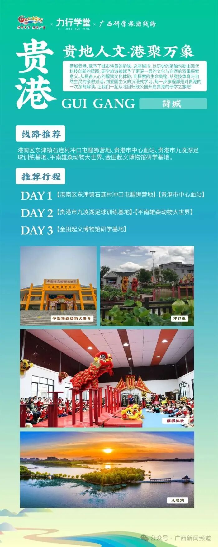 线路推荐:港南区东津镇石连村冲口屯醒狮营地;贵港市中心血站;贵港市九凌湖足球训练基地;平南雄森动物大世界;金田起义博物馆研学基地。