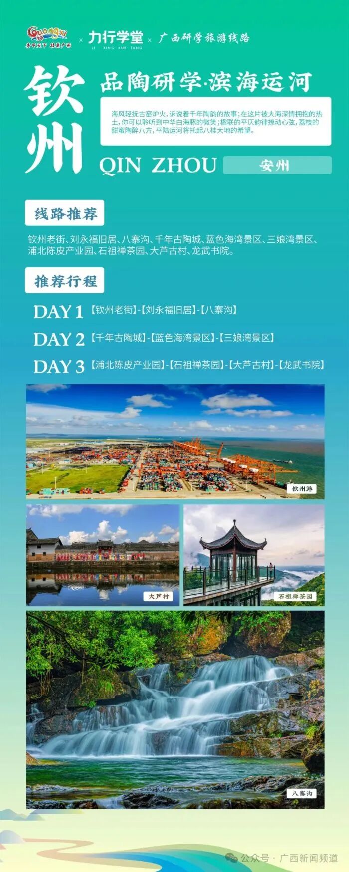 线路推荐:钦州老街、刘永福旧居;八寨沟;千年古陶城;蓝色海湾景区;三娘湾景区;浦北陈皮产业园;石祖禅茶园;大芦古村;龙武书院。