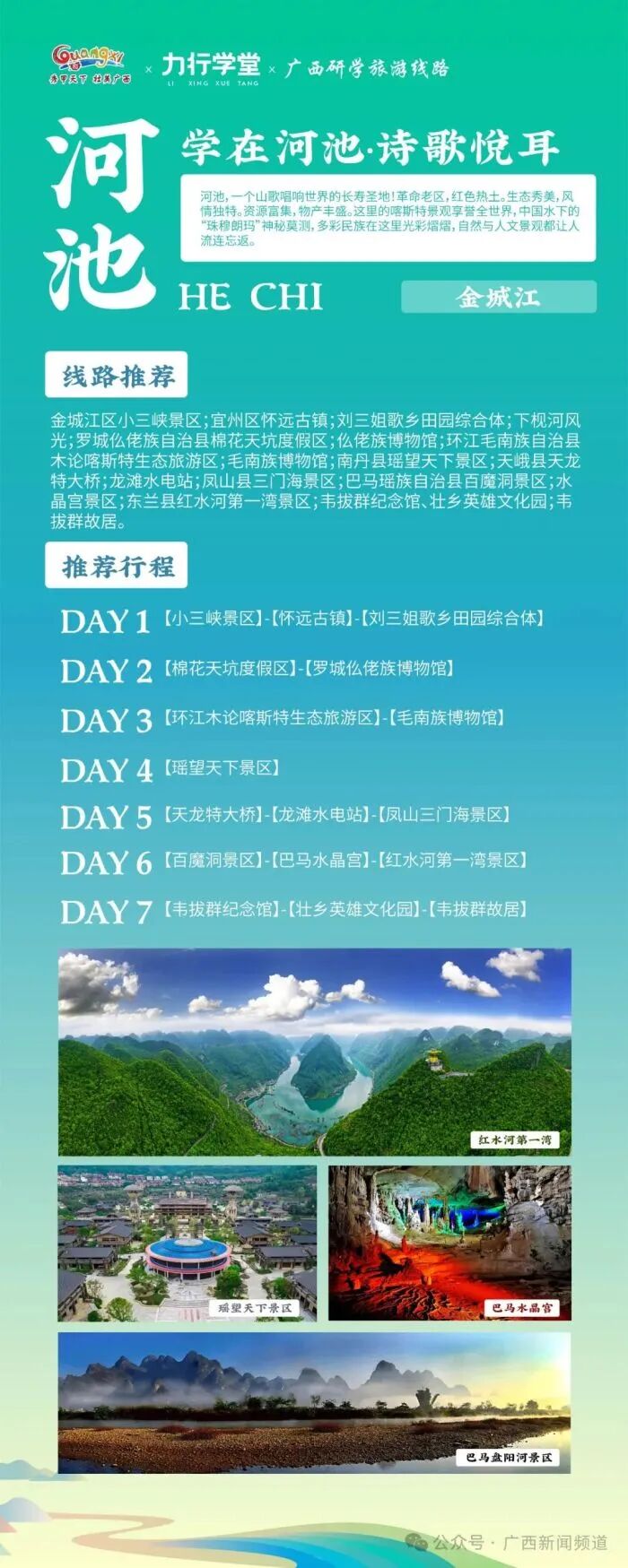 线路特色:河池,一个山歌唱响世界的长寿圣地!革命老区,红色热土。生态秀美,风情独特。资源富集,物产丰盛。这里的喀斯特景观享誉全世界,中国水下的“珠穆朗玛”神秘莫测,多彩民族在这里光彩熠熠,自然与人文景观都让人流连忘返。