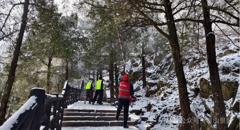 2024年入冬后第一场大雪的到来,不仅让玉泉寺披上了分外妖娆的雪妆,也给管理区的一亩松等古树的生长和生存带来了一定的威胁。为避免和最大限度减少降雪对古树名木的伤害,管理区迅速开展除雪行动。