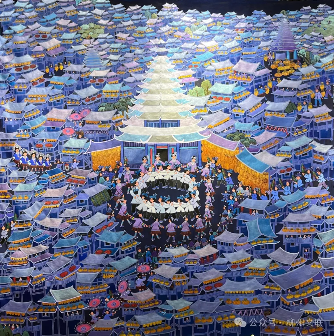 《美丽侗乡》描绘的是一幅侗寨里群众吹着芦笙、跳着多耶团结舞一同庆贺丰收的场景。画中穿插许多小故事,有送新娘、月也以及群众挑稻谷晒稻谷的场景,每一处画面细节都展现出侗族人民幸福团结、欣欣向荣的美好生活。