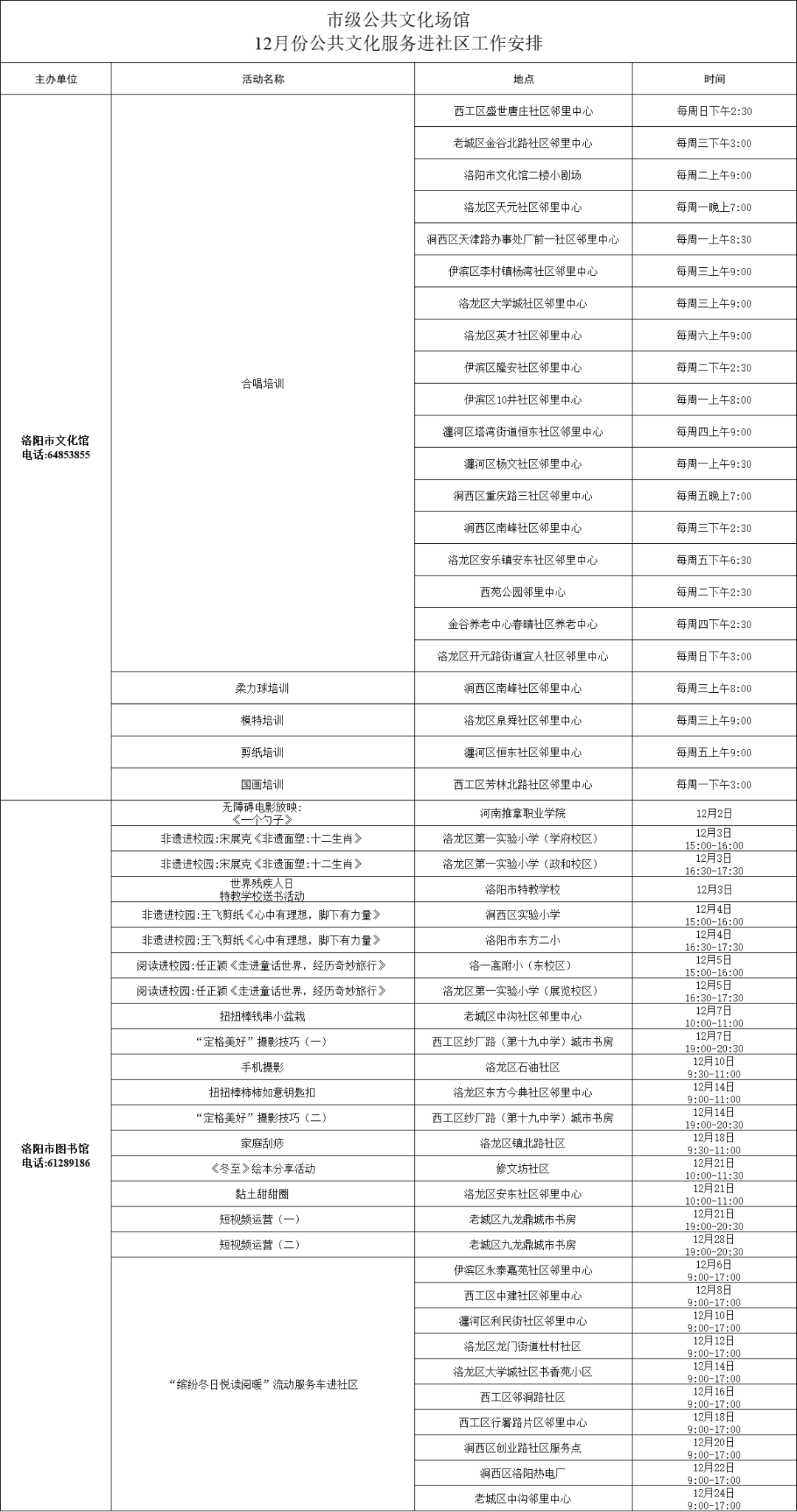 12月份,洛阳市文化馆安排了合唱、柔力球、剪纸、模特、国画等艺术培训活动,洛阳市图书馆安排了无障碍电影放映、摄影技巧、手工制作、非遗进校园、绘本分享等阅读推广活动,让群众在“家门口”就能享受文化大餐,进一步提升群众的文化获得感、幸福感。