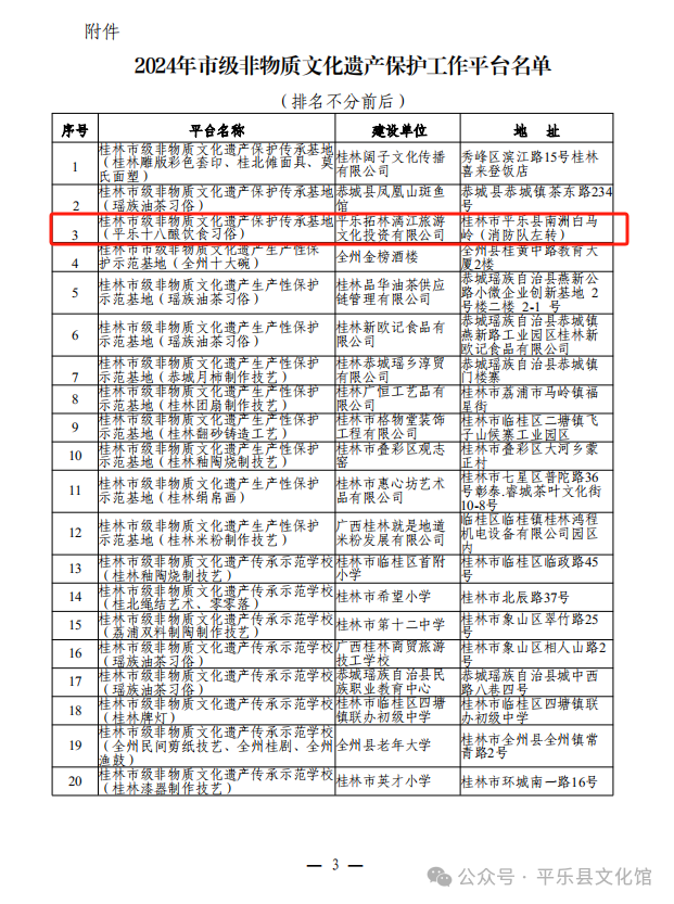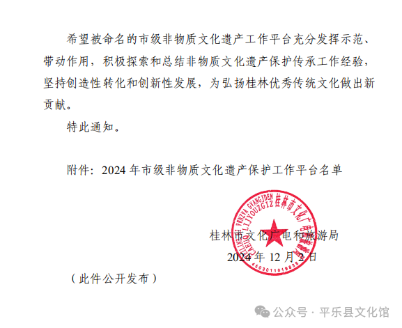 为进一步加大非物质文化遗产保护传承力度 ,促进非物质文化遗产的保护传承和可持续发展,推动科学保护,直观活态地宣传、弘扬、展示和传承非物质文化遗产,根据《 桂林市文化广电和旅游局关于申报市级非物质文化遗产保护工作平台的通知 》精神 ,平乐县文化馆通过前期踩点摸排,对符合条件的企业及基地进行综合评价,根据文件要求通过“硬件+软件”双重标准筛选,最终推荐平乐拓林漓江旅游文化投资有限公司参加桂林市级非物质文化遗产保护传承基地评选。