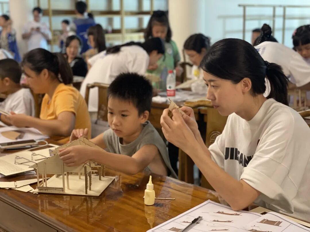 参观讲解结束后,与课观众们来到武侯书院,亲子协力制作武侯祠过厅古建筑木模型。该模型由成都栋方学堂根据武侯祠过厅建筑等比例缩小设计制作。孩子们参照古建筑的营造工序,将台明、柱梁、卷棚顶等积木零件自下而上拼接搭建,依建筑原型挂起一幅幅袖珍的楹联、匾额,最后将题写着“武侯祠”三个大字的标志性牌匾郑重安放于建筑正中,一个微观的“武侯祠过厅”建筑模型就此组建成功。孩子们不仅体验到手作的乐趣,更加深了对中国文化与古代科技的了解与认同。
